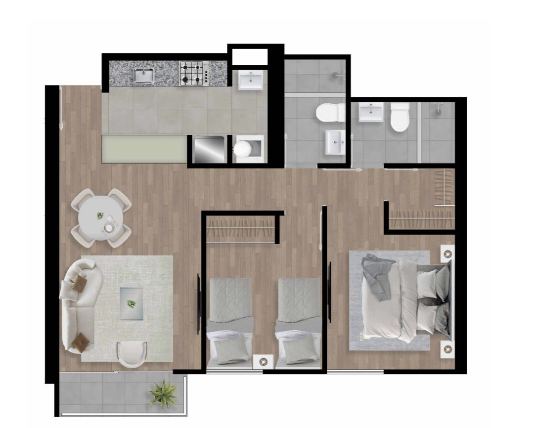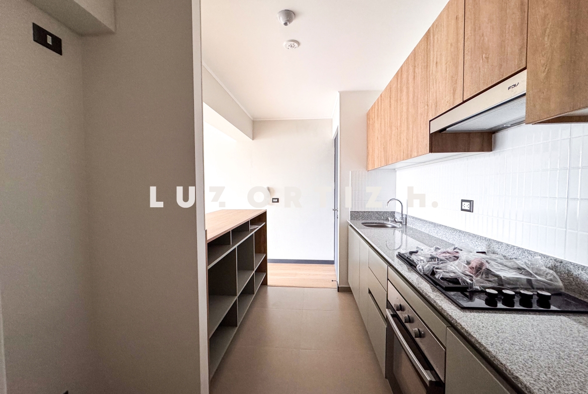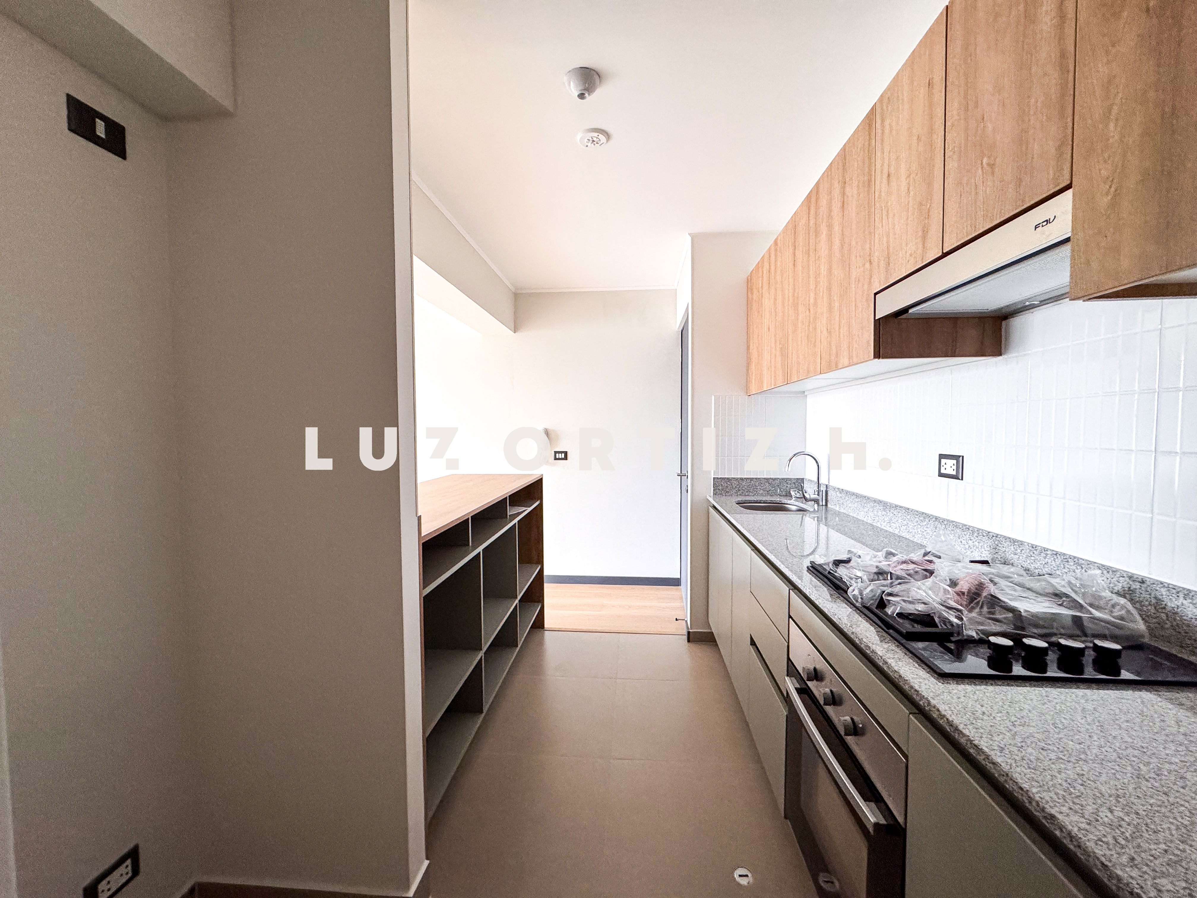 Comoda sala comedor, un pequeño balcon que se integra con esta area social, cocina americana con muebles alts y bajos, zona de lavanderia y en el area privada contamos con 2 habitaciones, la principal con walkin closet y baño incorporado. adicionalmente un baño completo que funciona como baño de visitas.