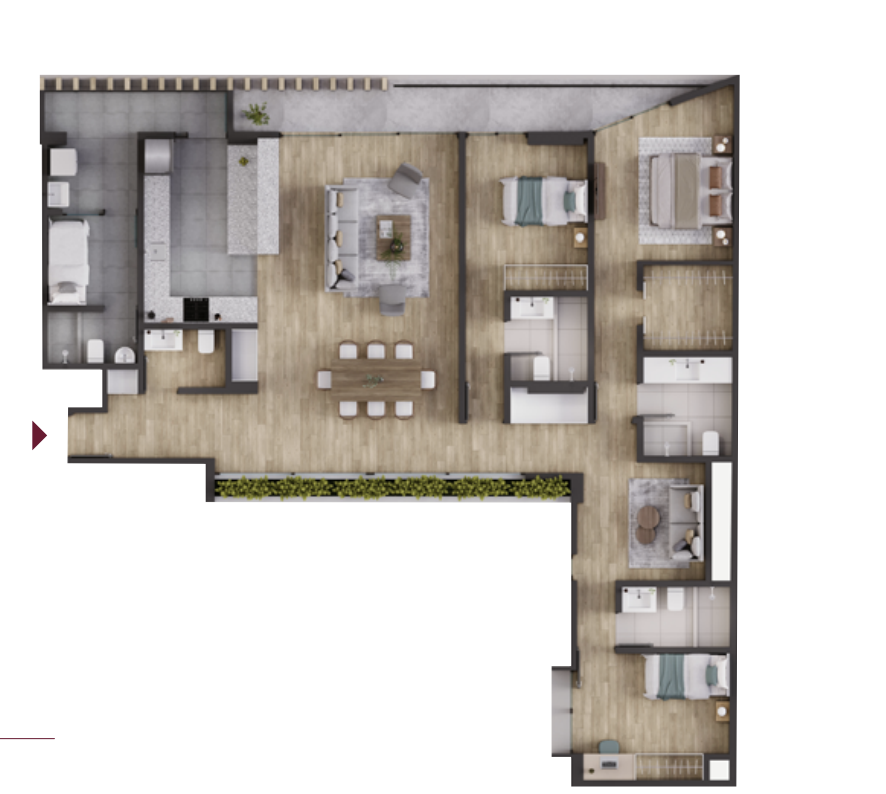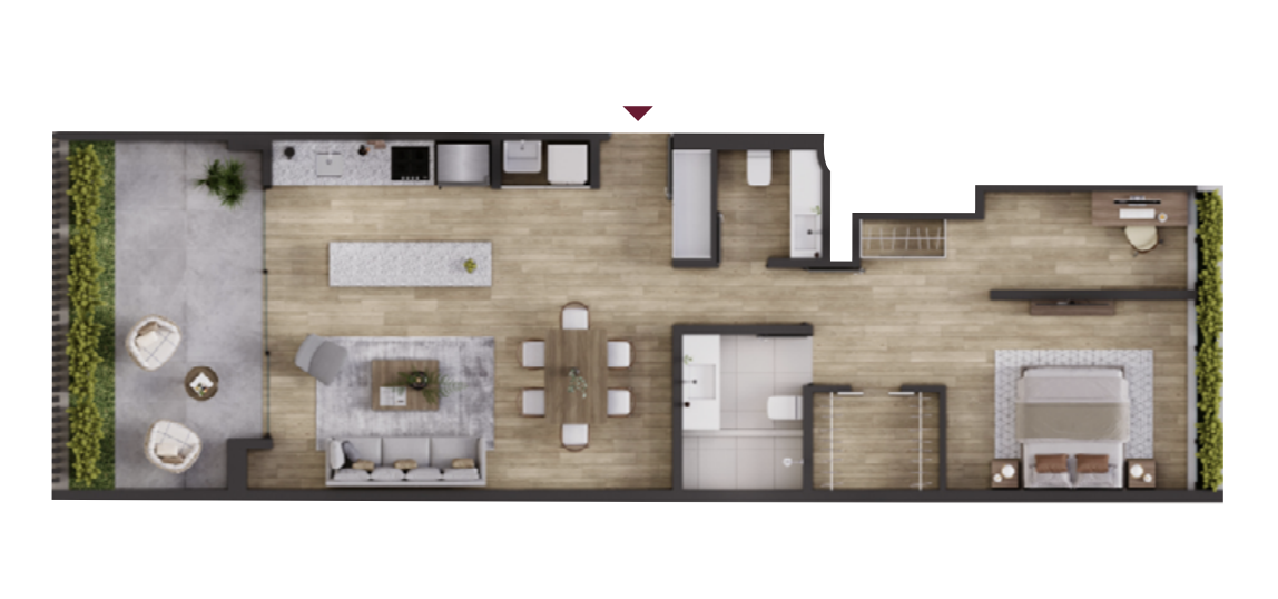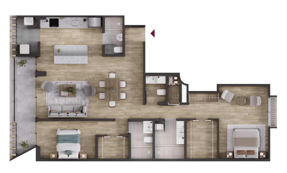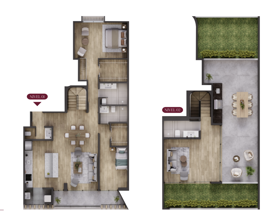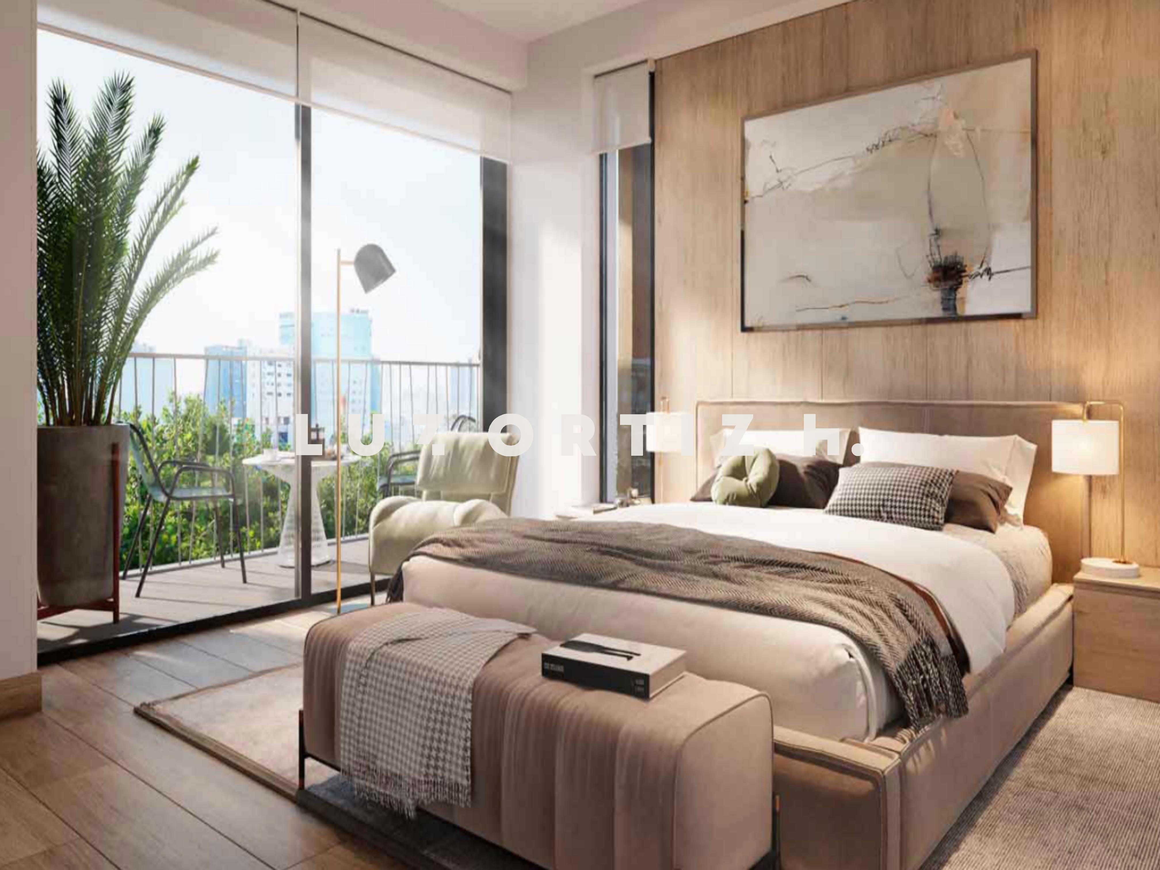 El proyecto cuenta con departamentos de 1, 2 y 3 dormitorios en diferentes configuraciones: flats, dúplex y penthouses. Todas las unidades destacan por sus áreas sociales bien distribuidas, amplias salas con ventanales, cocinas modernas con muebles de alta calidad, dormitorios con clósets y baños incorporados, además de terrazas privadas que permiten disfrutar de vistas despejadas.