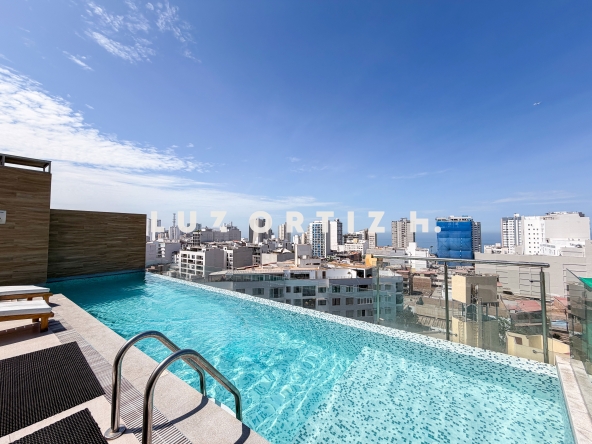 El en exclusivo Edificio MQ700, el inmueble esta ubicado en 2do piso y el ingreso es con ascensor directo, cuenta con sala comedor, baño de visitas, cocina cerrada con isla sobre tablero de granito negro, area de lavandería, cuarto y baño de servicio.
