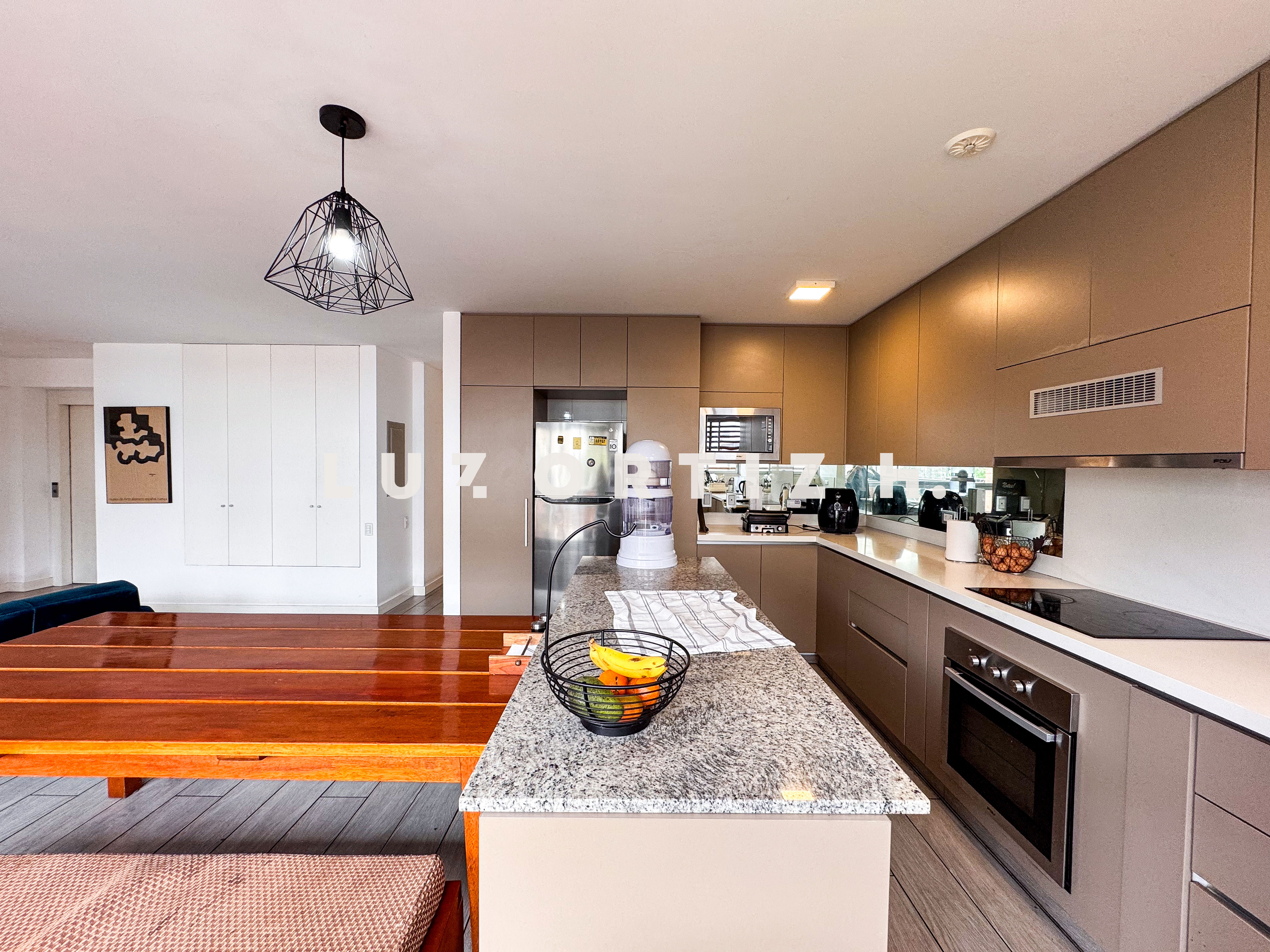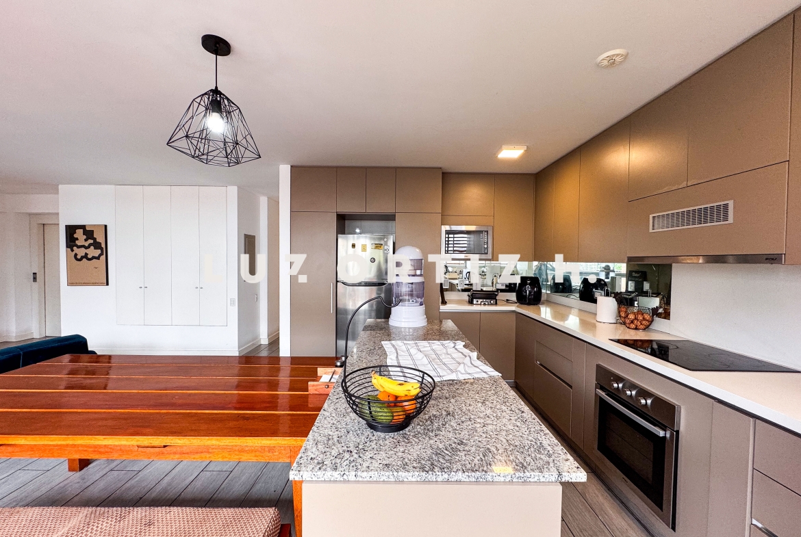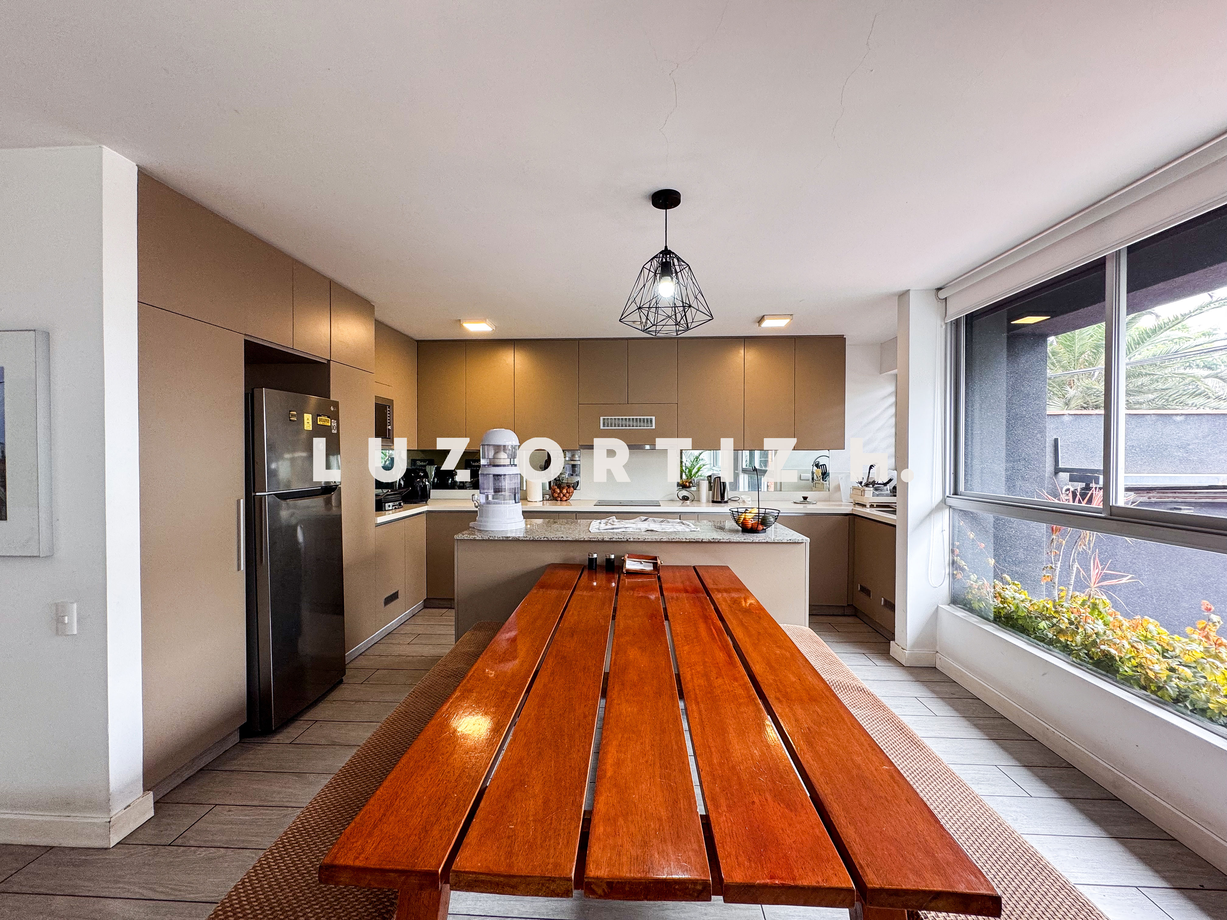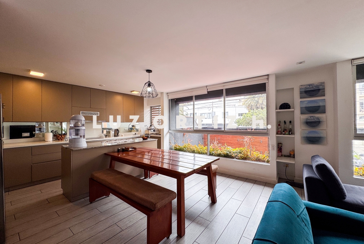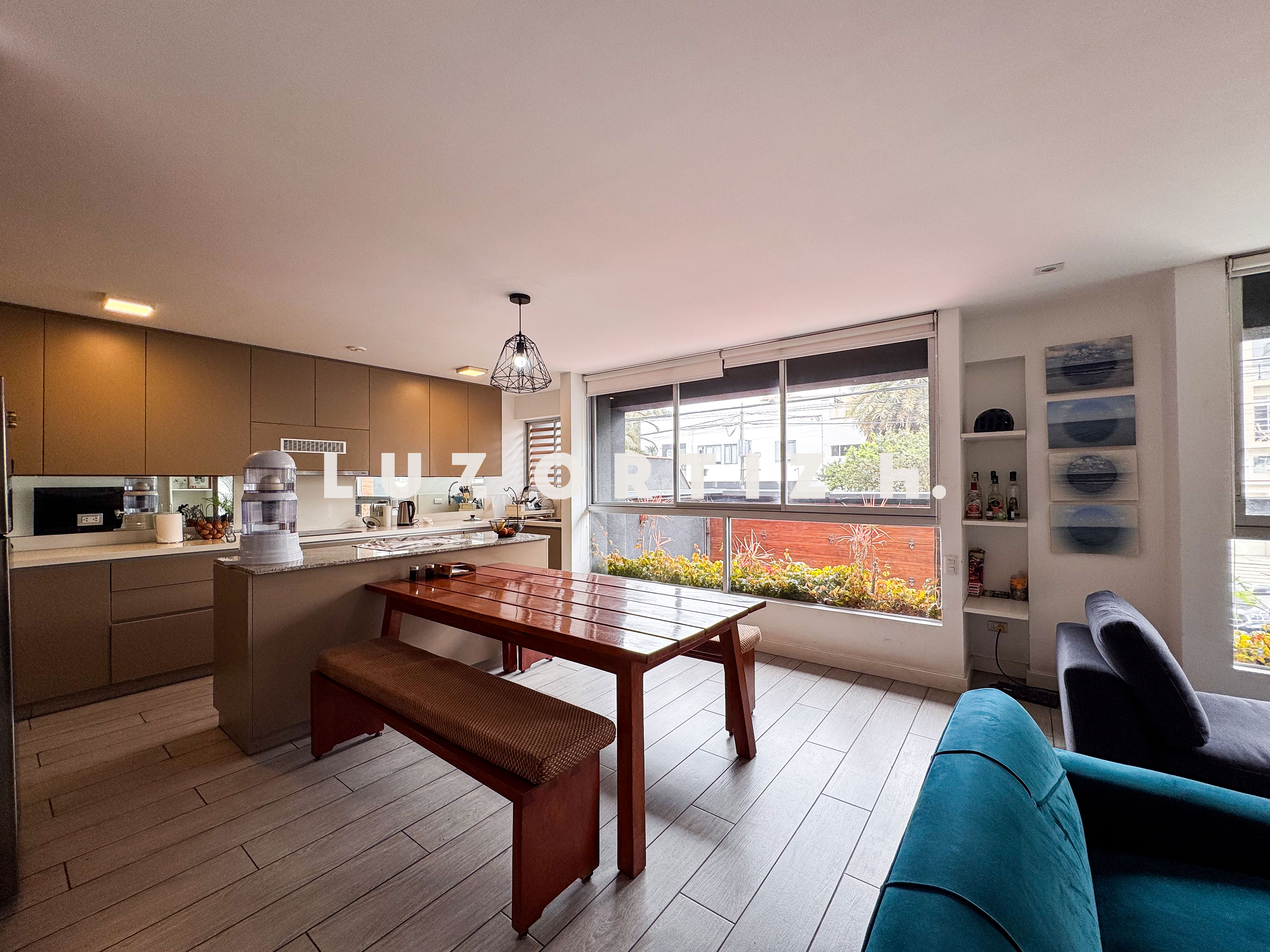 Cuenta con una amplia sala comedor con vista a la calle, cocina americana equipada con muebles altos y bajos, además de una cómoda isla central que integra perfectamente los ambientes sociales.