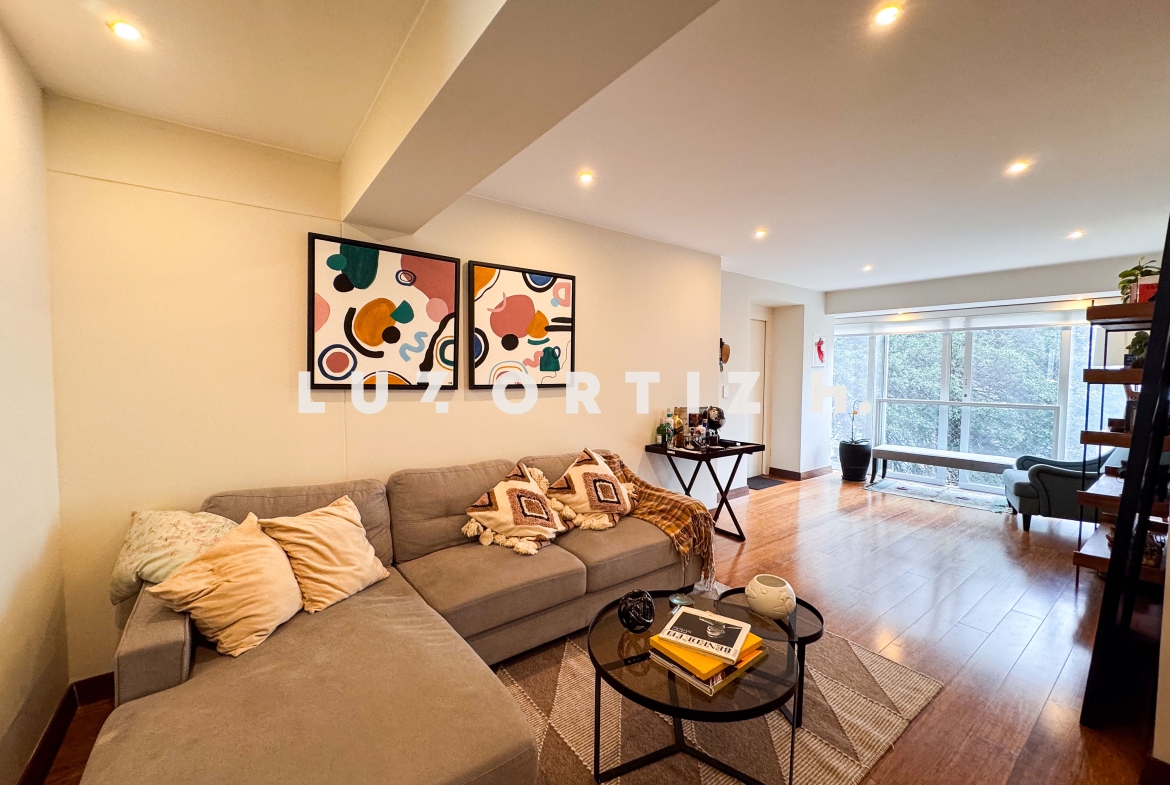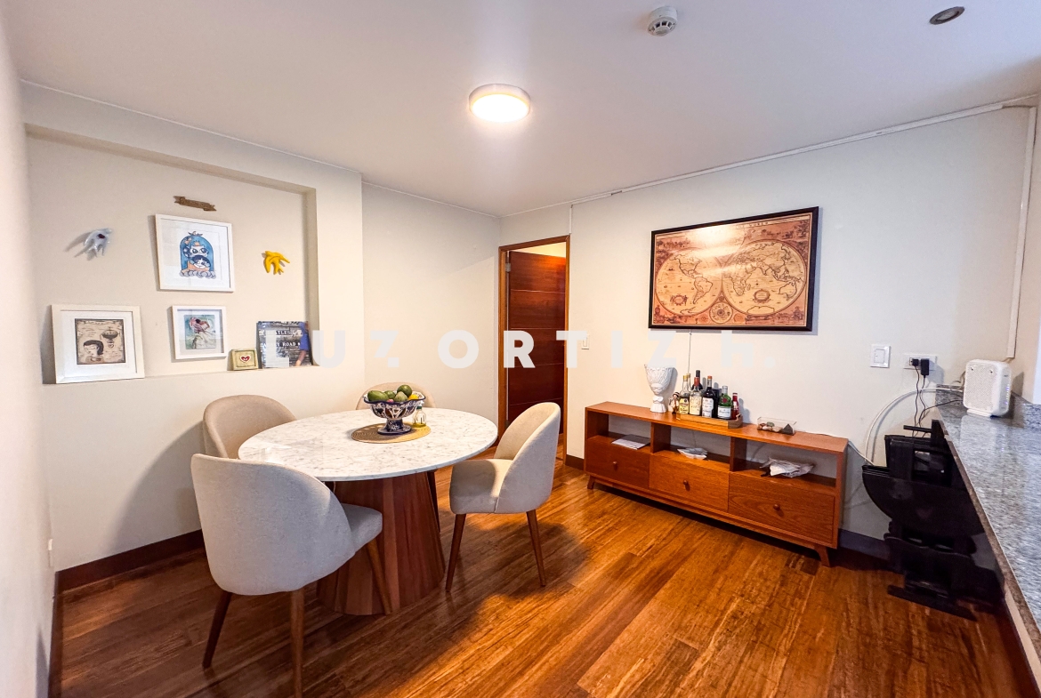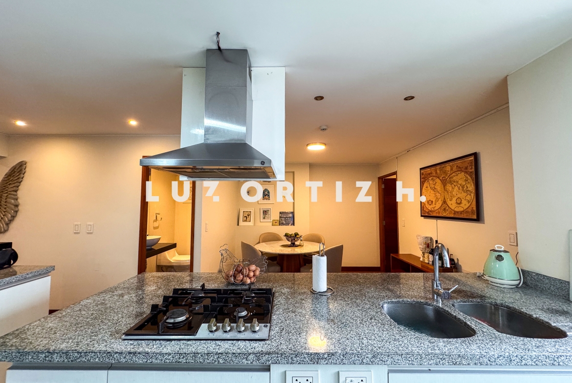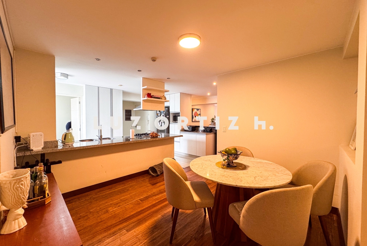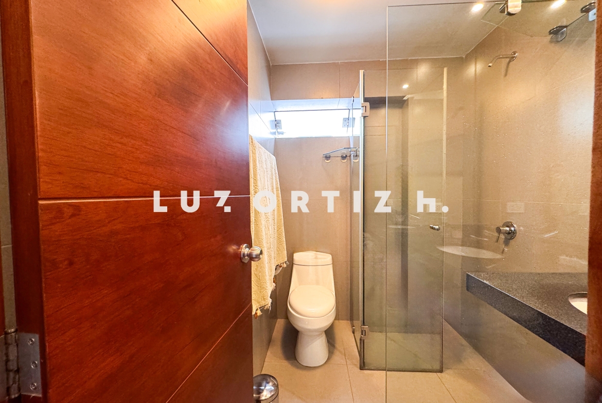 El departamento cuenta con una distribución muy funcional sala comedor con vista a la copa de los arboles, cocina abierta moderna que se integra perfectamente al espacio social.en el area privada cuenta con dos dormitorios, cada uno con baño incorporado, lo que brinda mayor privacidad y comodidad. Además, incluye un baño de visita,