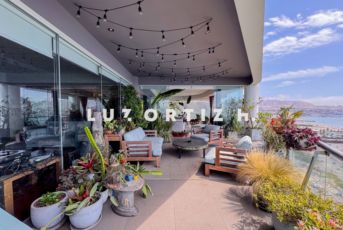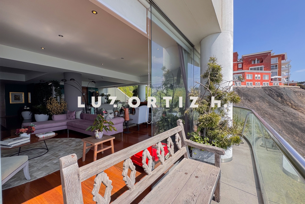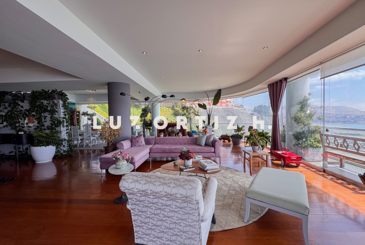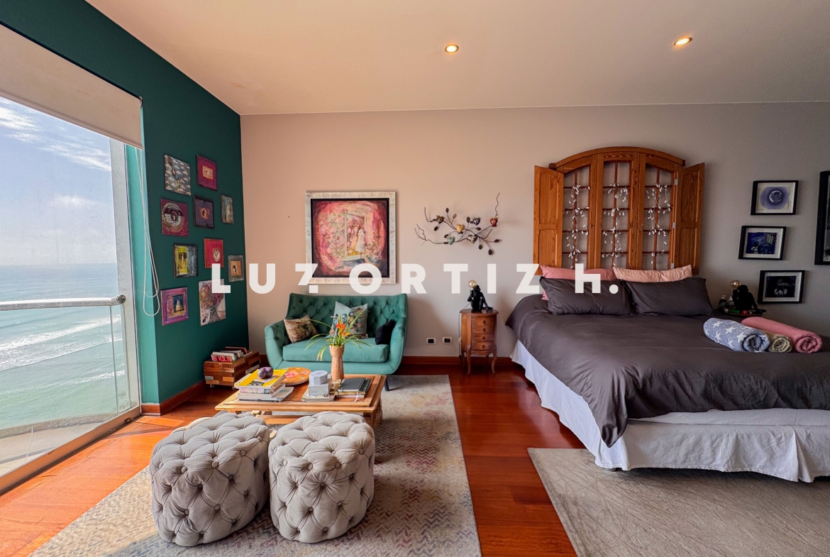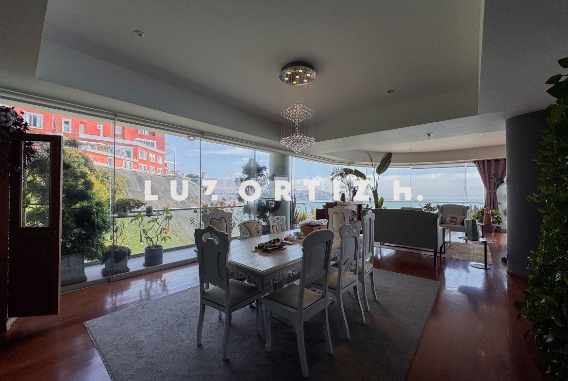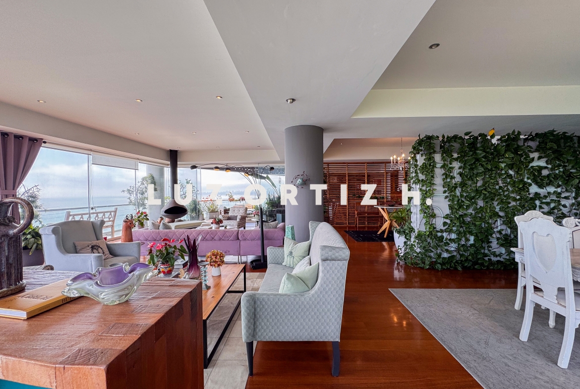 El departamento se encuentra en el piso 4 y destaca por sus amplios espacios y su vista directa y panorámica al océano. Cuenta con una gran sala comedor con ventanales de piso a techo que permiten disfrutar de una iluminación excepcional y del paisaje costero en todo momento. Además, dispone de una amplia terraza frontal con vista panorámica tanto al mar como a la ciudad, ideal para compartir reuniones sociales, descanso o simplemente disfrutar del atardecer.