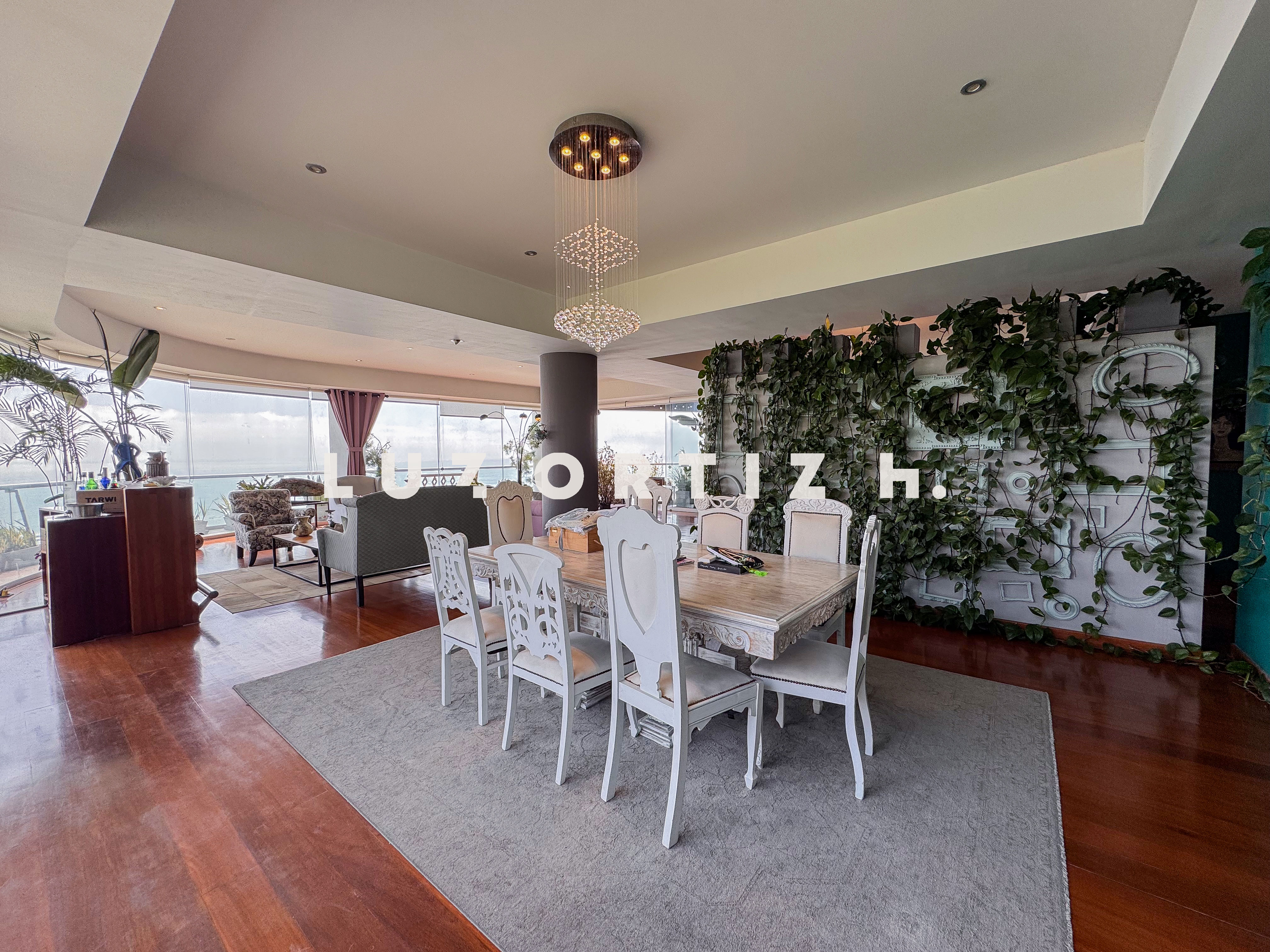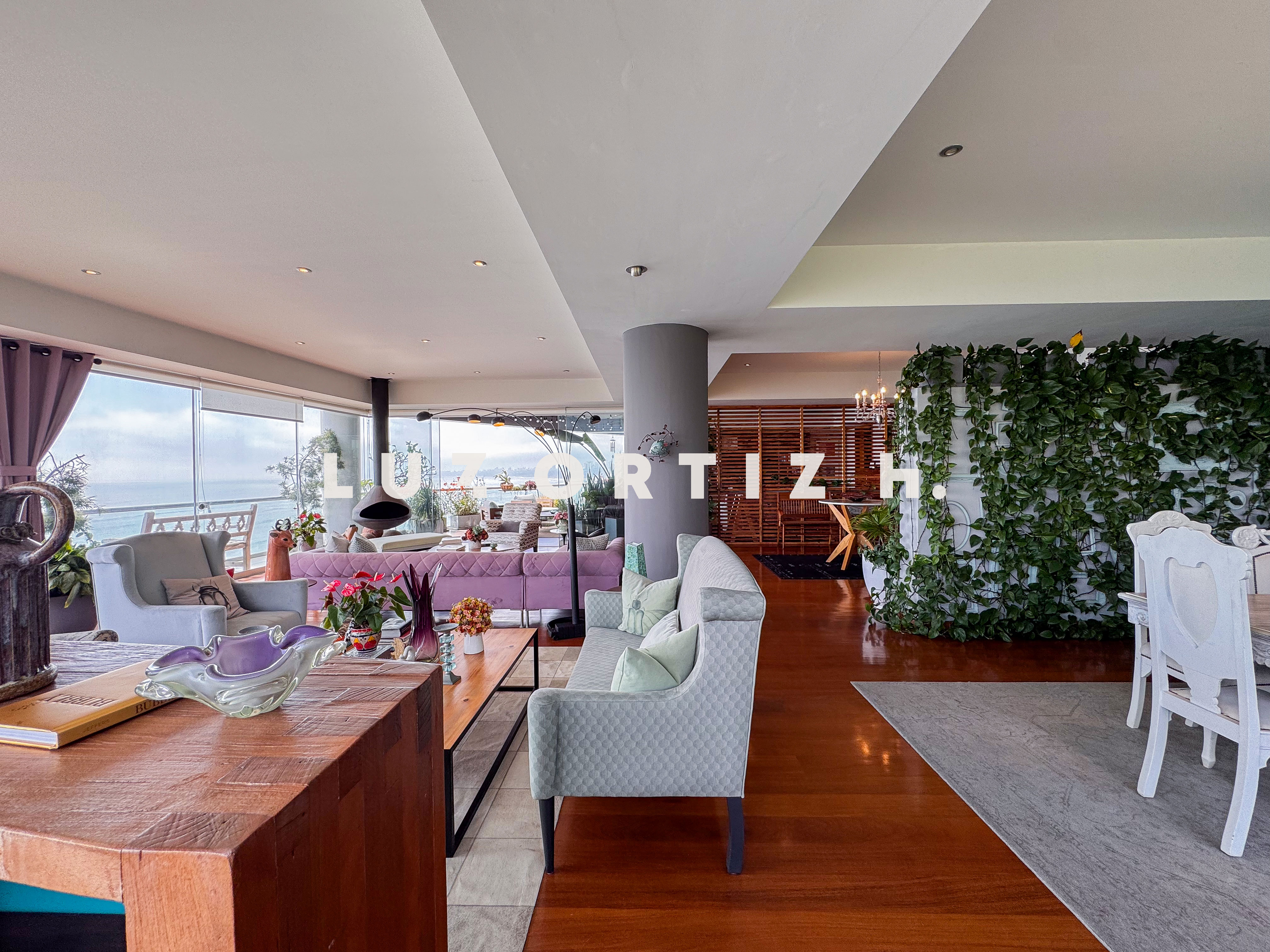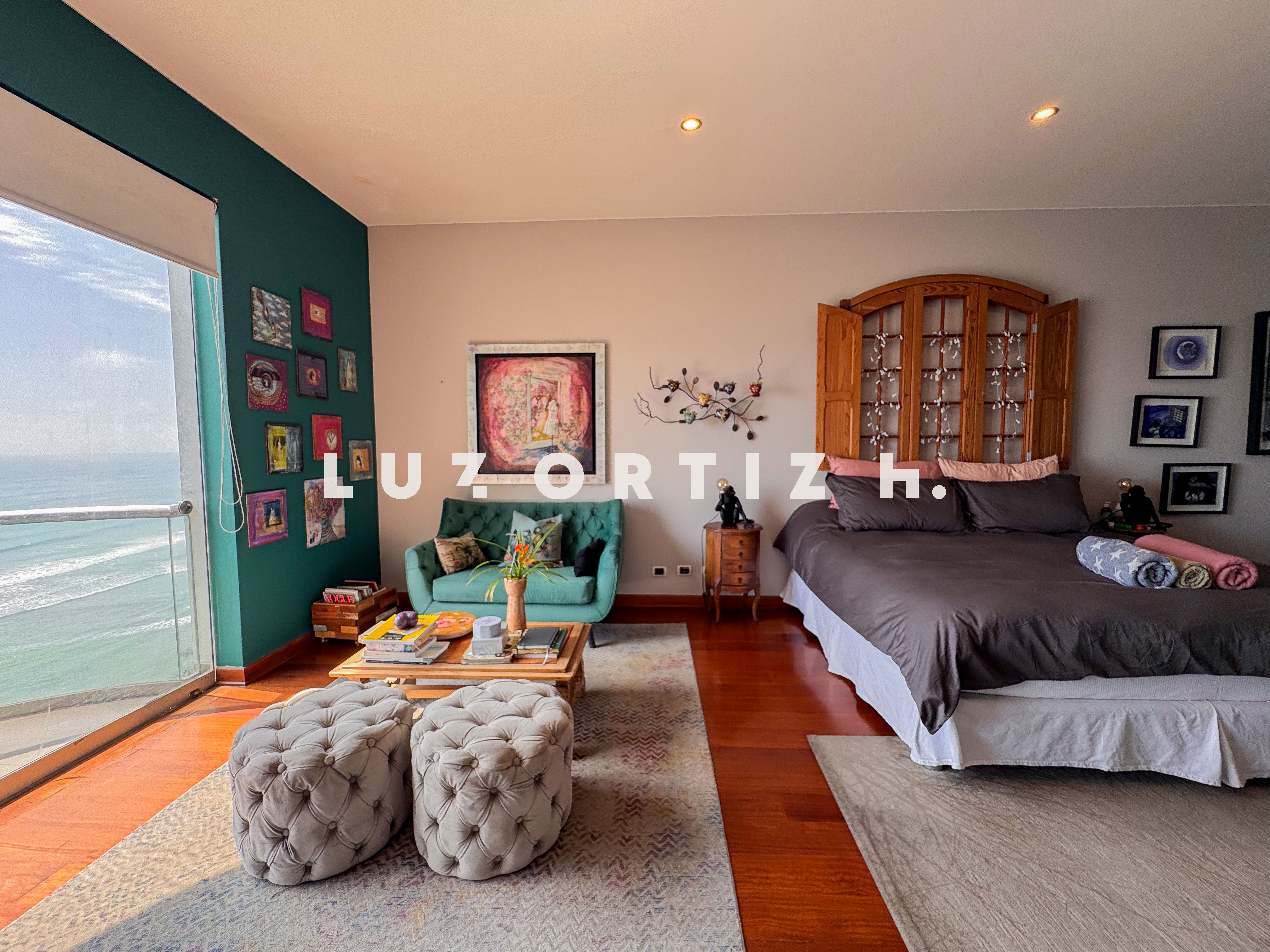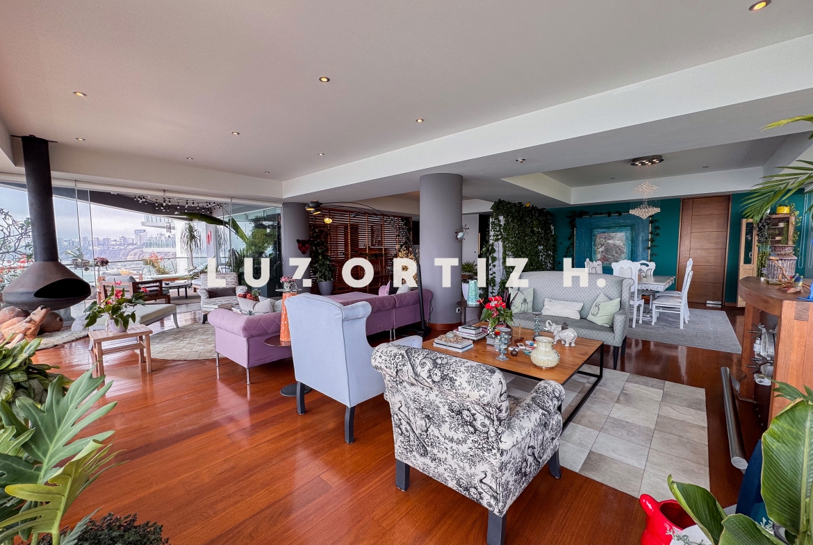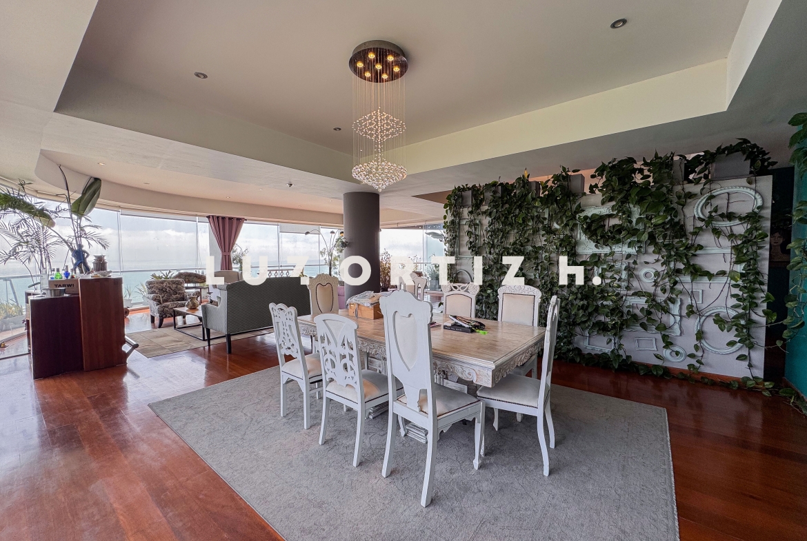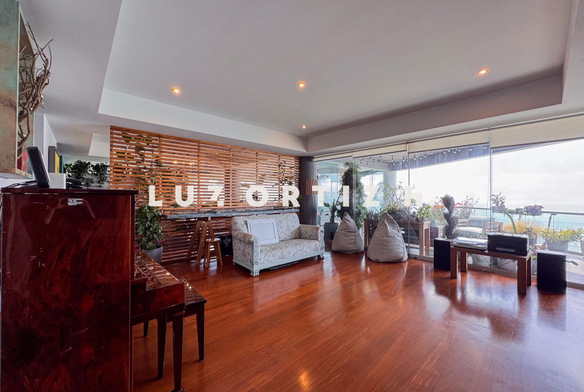 El departamento se encuentra en el piso 4 y destaca por sus amplios espacios y su vista directa y panorámica al océano. Cuenta con una gran sala comedor con ventanales de piso a techo que permiten disfrutar de una iluminación excepcional y del paisaje costero en todo momento. Además, dispone de una amplia terraza frontal con vista panorámica tanto al mar como a la ciudad, ideal para compartir reuniones sociales, descanso o simplemente disfrutar del atardecer.