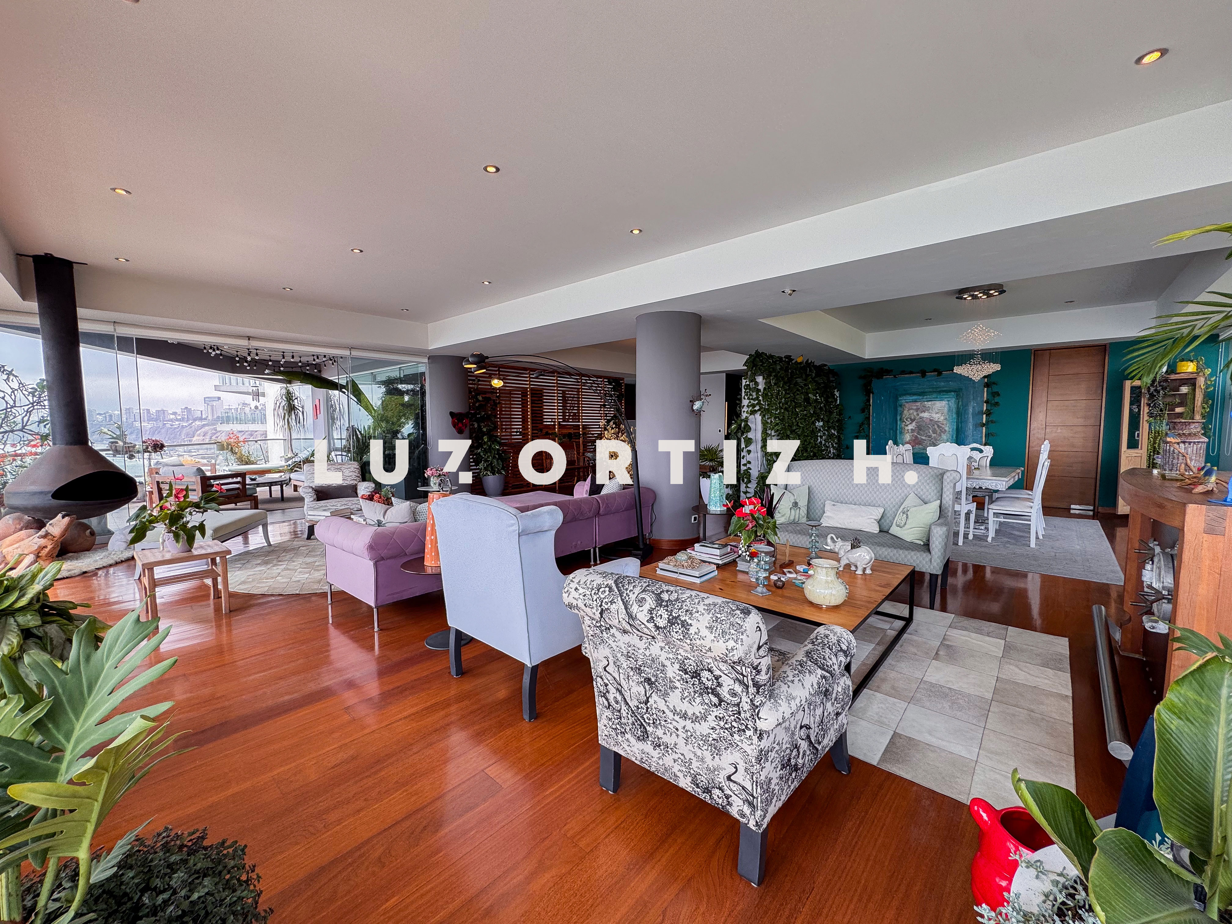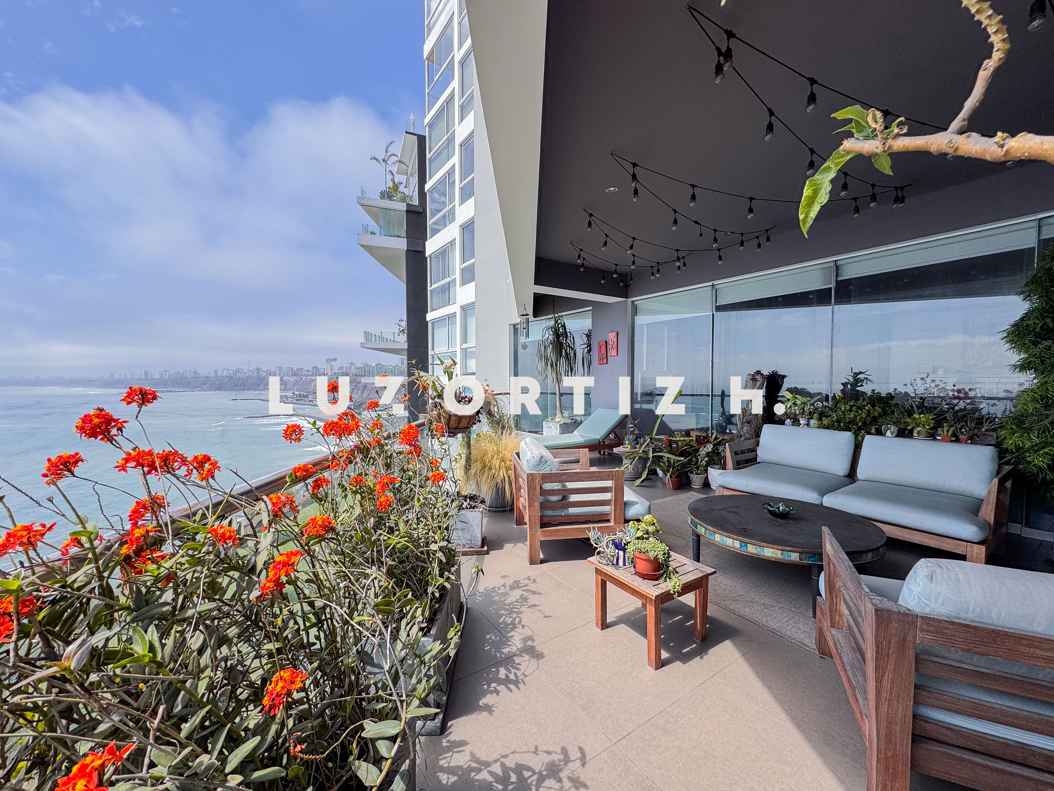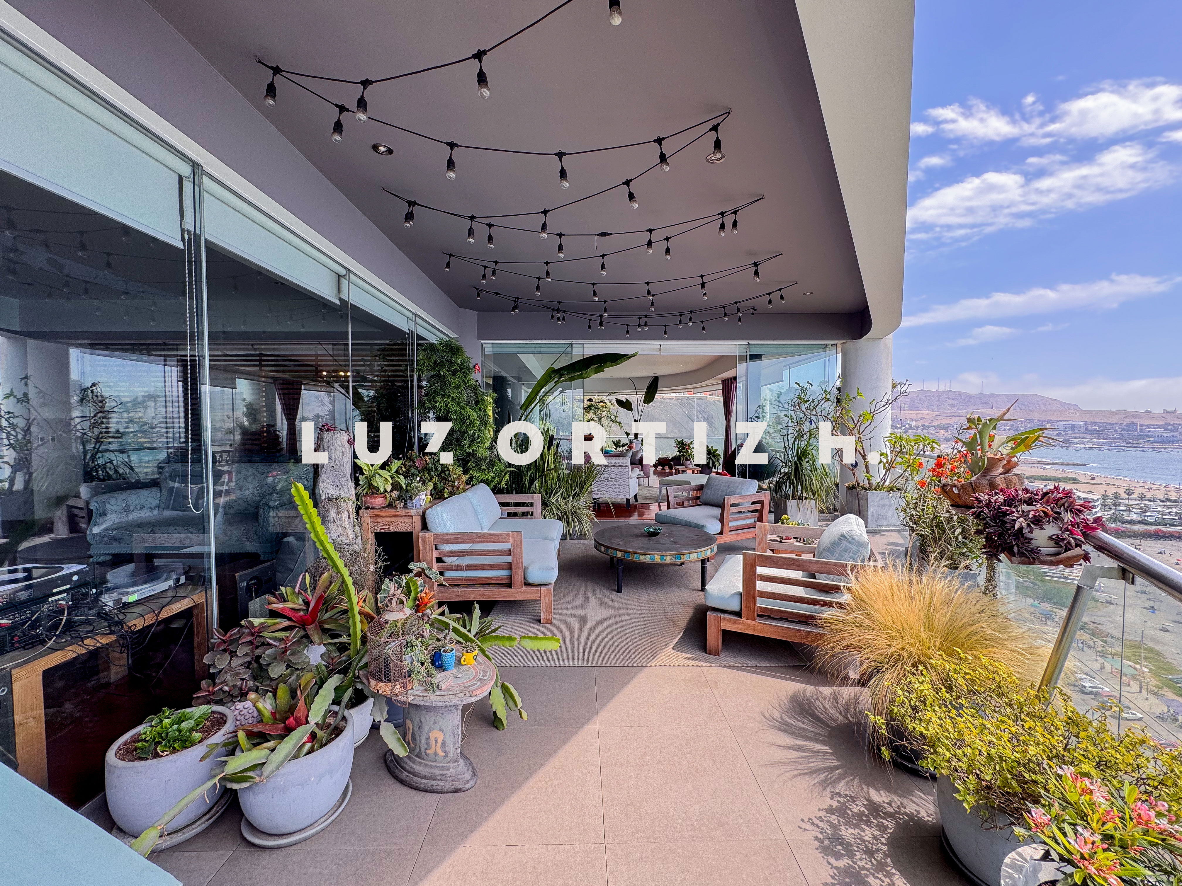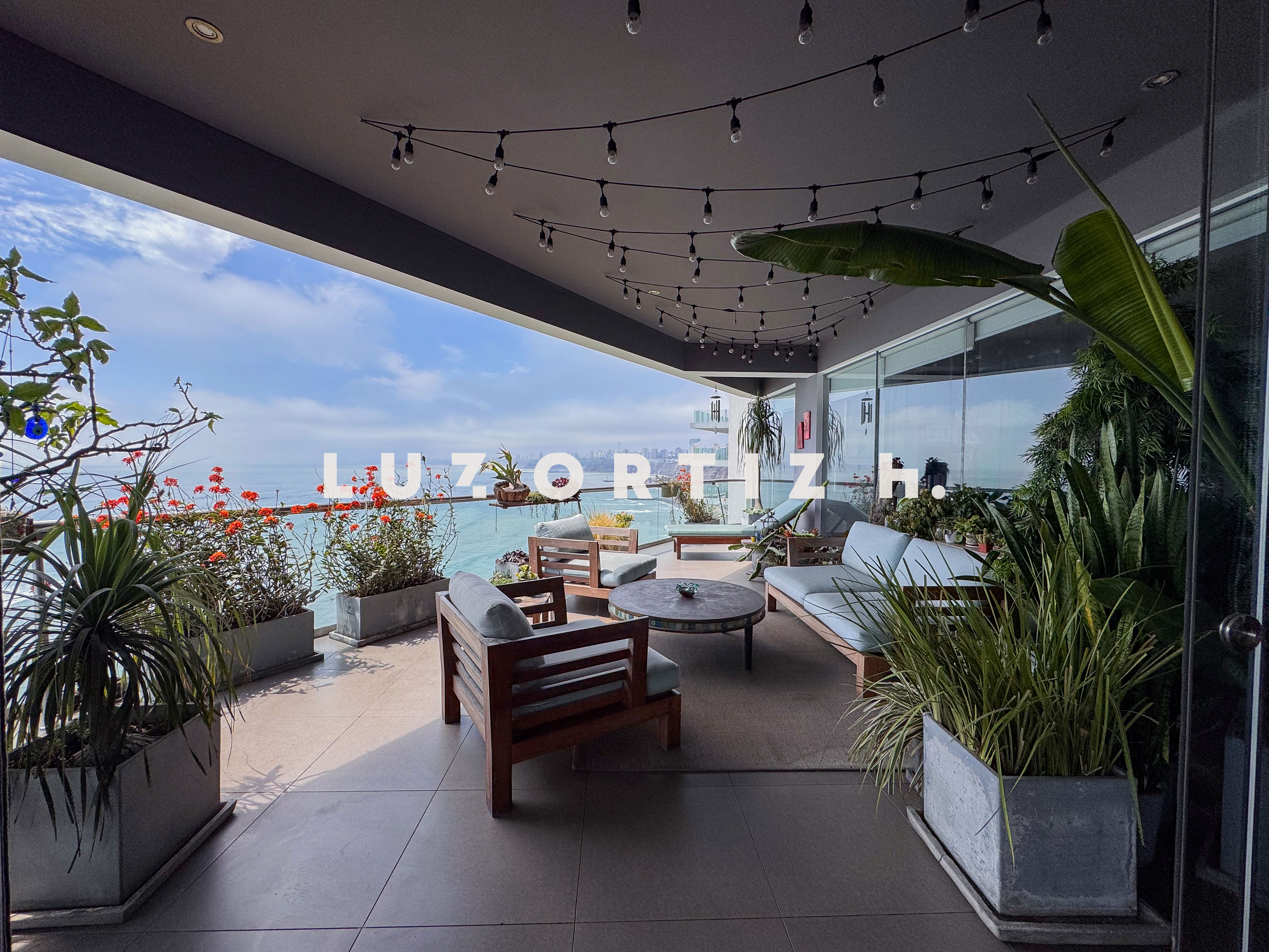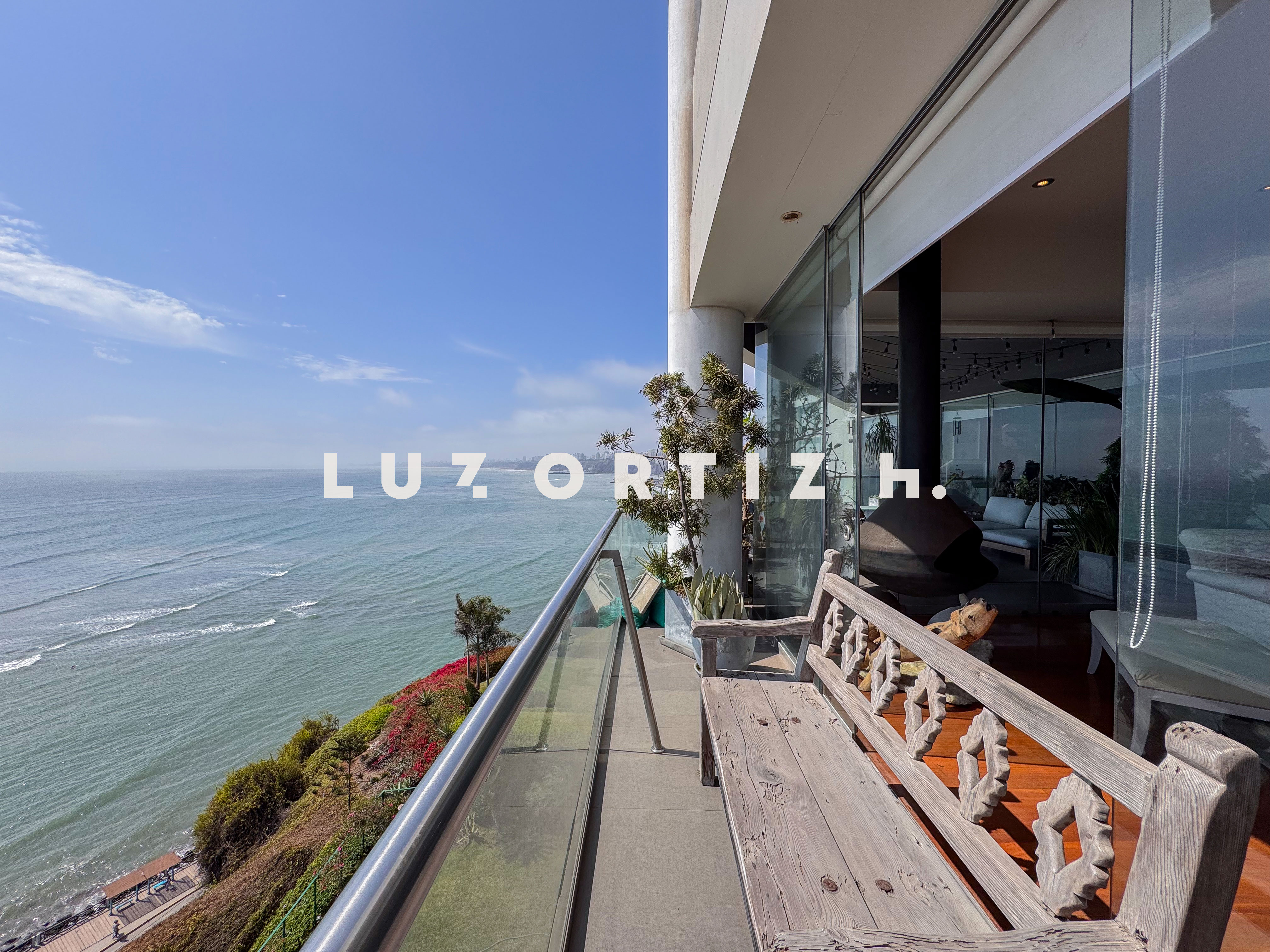 El departamento se encuentra en el piso 4 y destaca por sus amplios espacios y su vista directa y panorámica al océano. Cuenta con una gran sala comedor con ventanales de piso a techo que permiten disfrutar de una iluminación excepcional y del paisaje costero en todo momento. Además, dispone de una amplia terraza frontal con vista panorámica tanto al mar como a la ciudad, ideal para compartir reuniones sociales, descanso o simplemente disfrutar del atardecer.