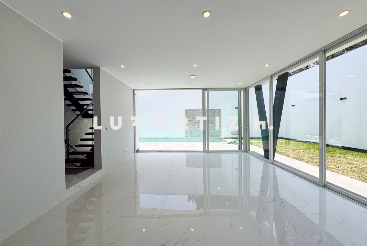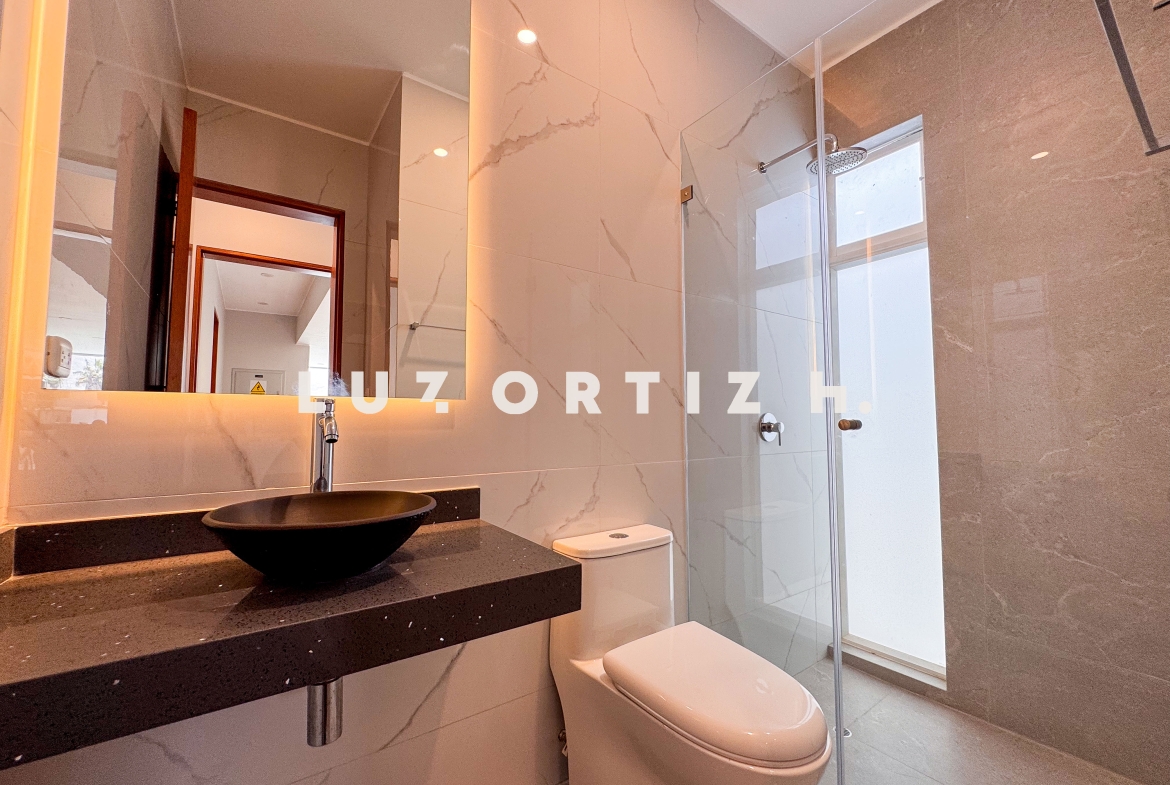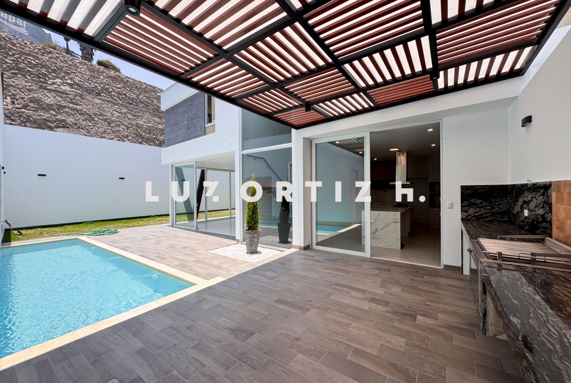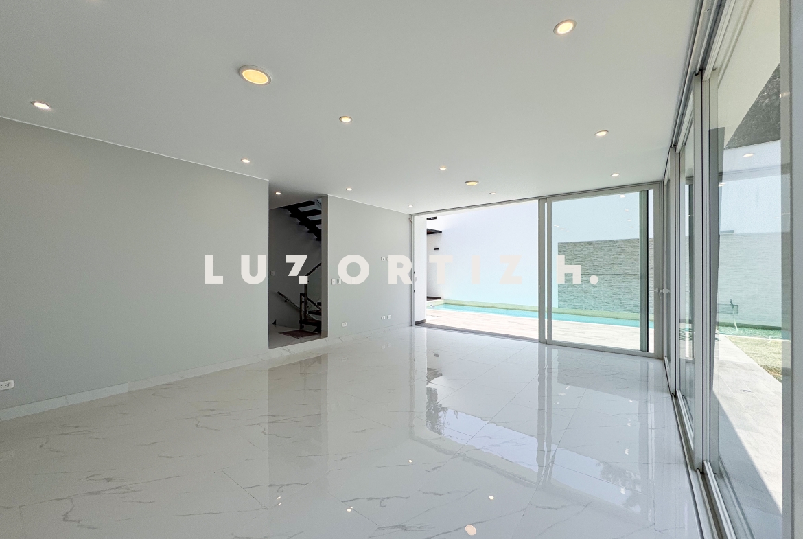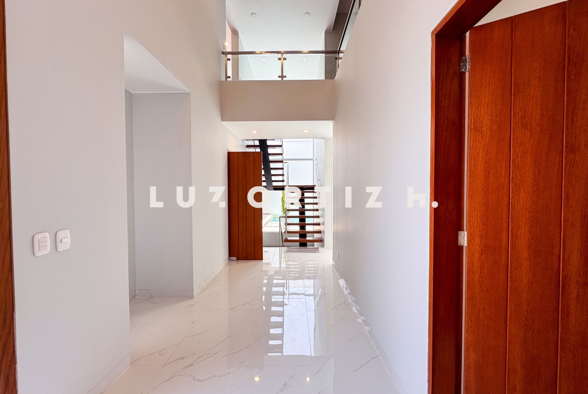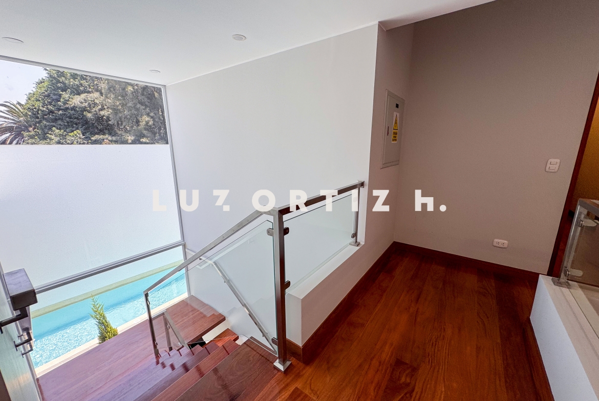 En el primer nivel, un elegante hall de ingreso da la bienvenida a una amplia sala y comedor con excelente iluminación natural y vista directa a la terraza. La terraza cuenta con una zona de parrilla ideal para reuniones sociales y familiares, además de una piscina privada perfecta para disfrutar del sol durante todo el año. La cocina es cerrada, moderna y funcional, equipada con muebles altos y bajos en melamina de alta calidad y tablero de granito. También dispone de un baño de visitas y un estudio u oficina, ideal para el trabajo remoto o como sala de lectura.