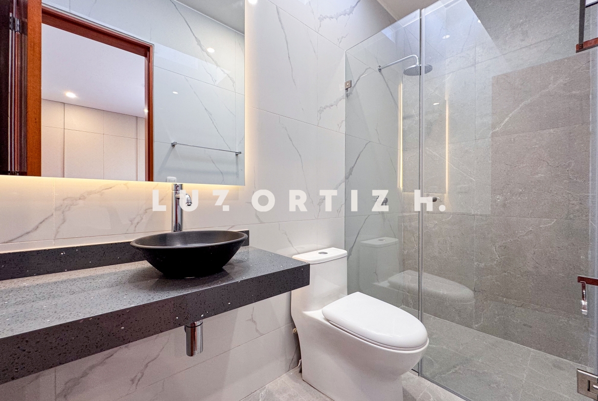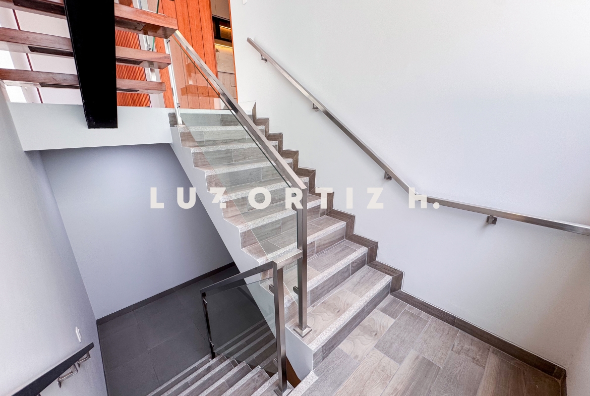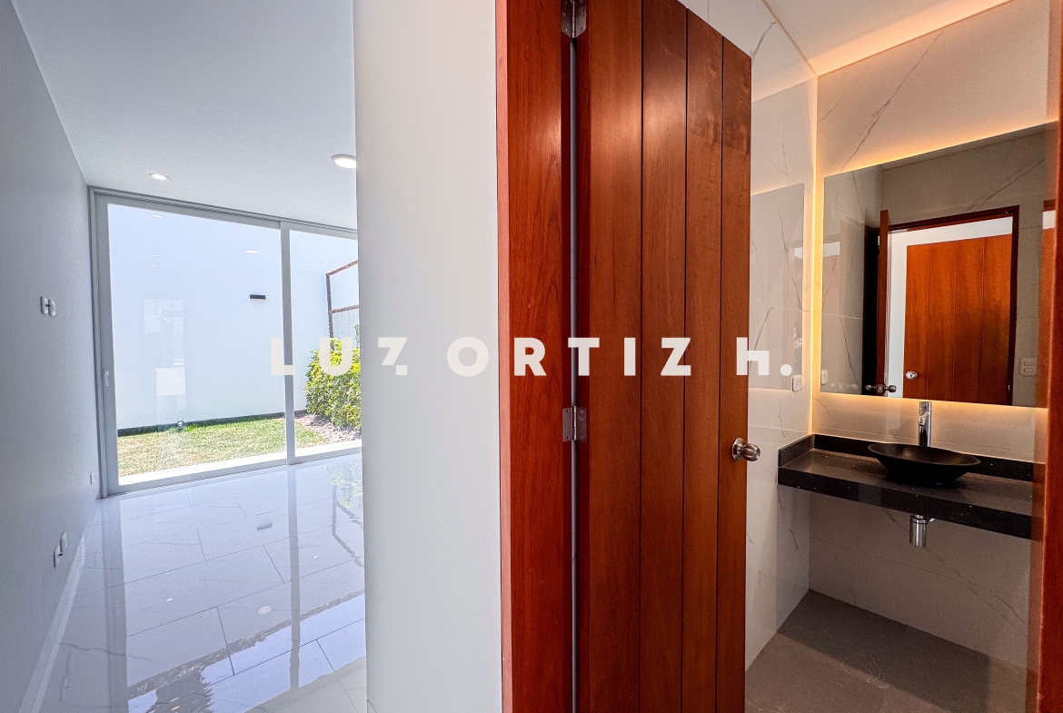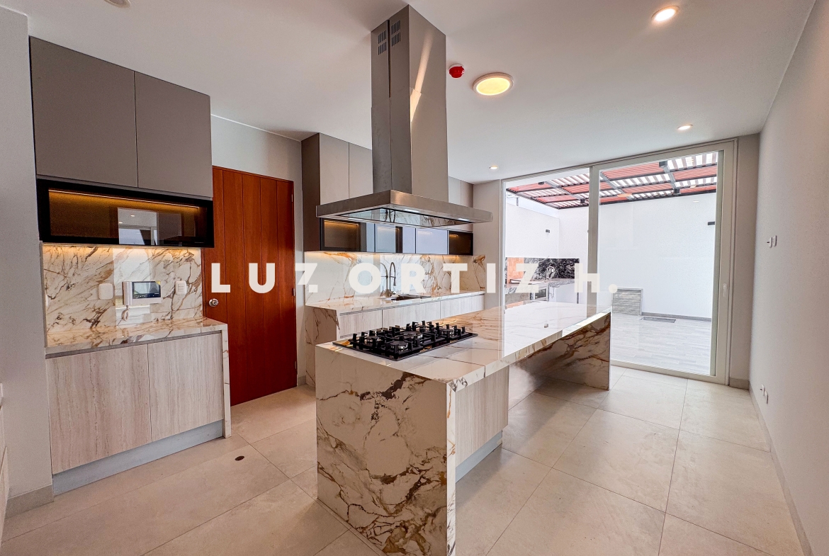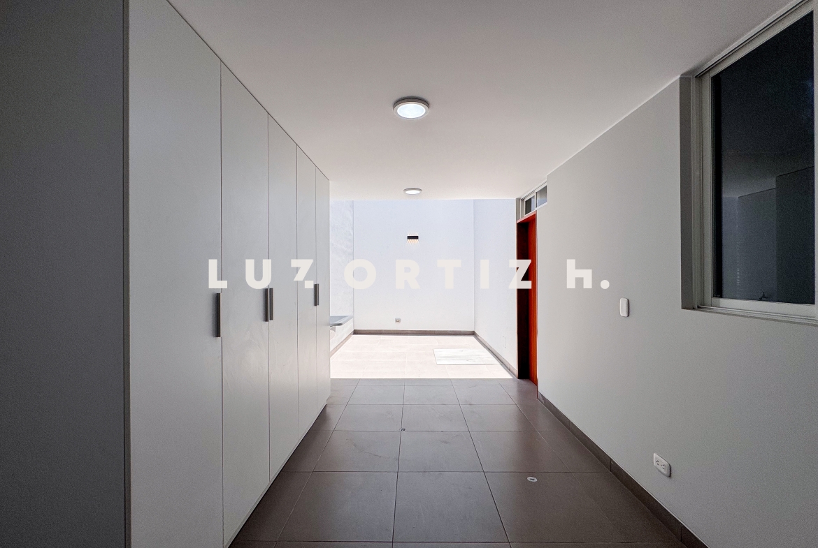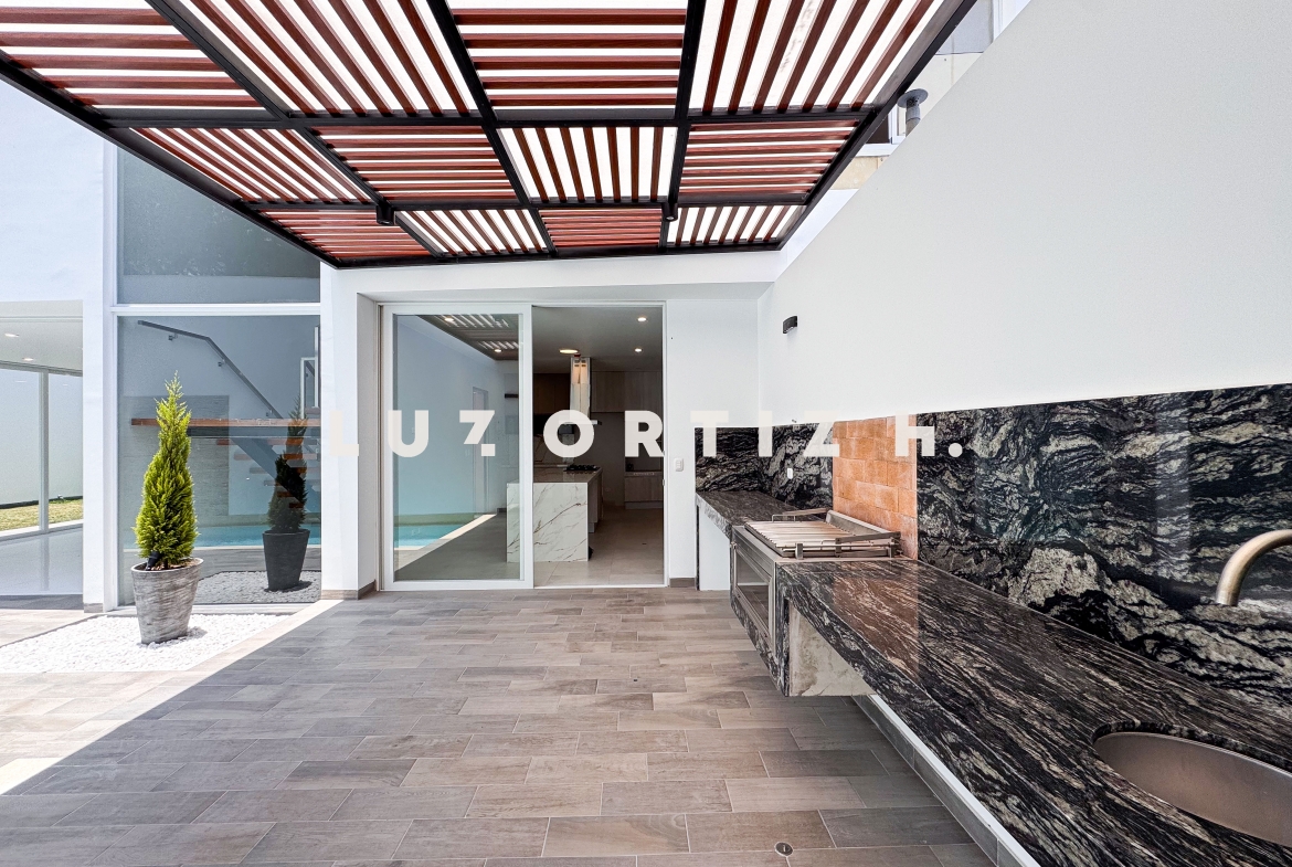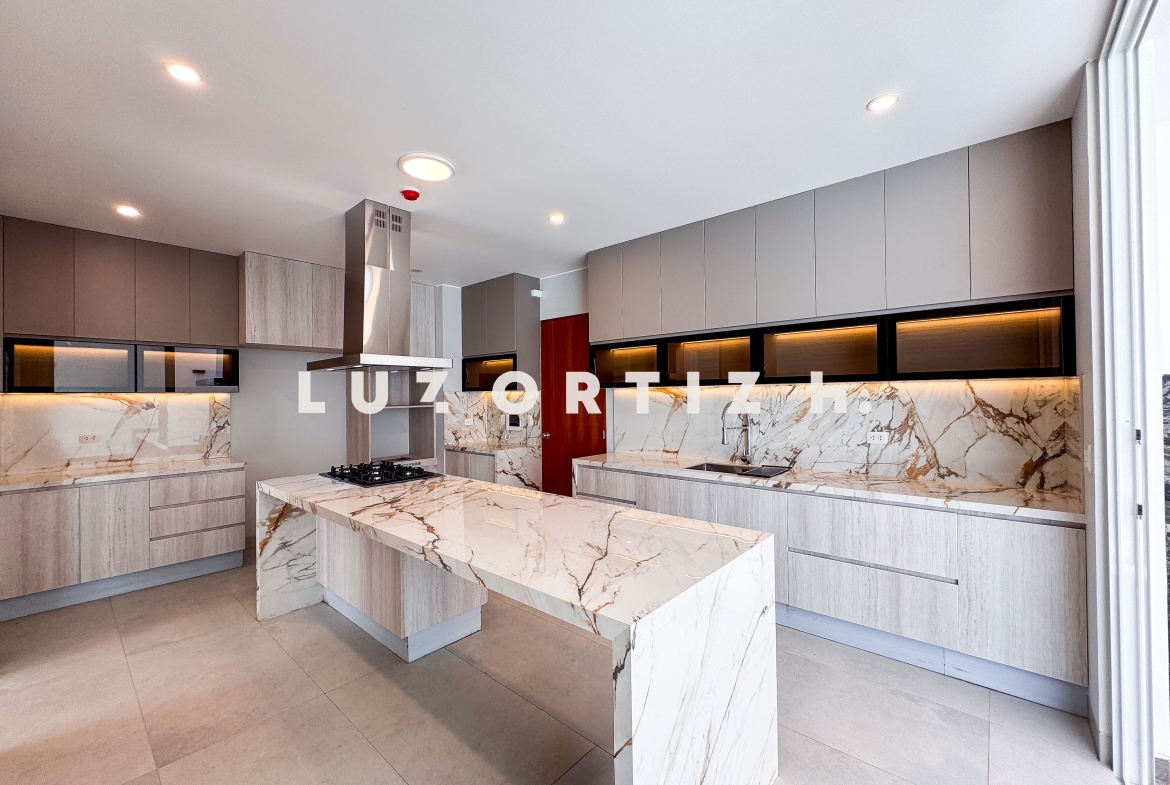 En el primer nivel, un elegante hall de ingreso da la bienvenida a una amplia sala y comedor con excelente iluminación natural y vista directa a la terraza. La terraza cuenta con una zona de parrilla ideal para reuniones sociales y familiares, además de una piscina privada perfecta para disfrutar del sol durante todo el año. La cocina es cerrada, moderna y funcional, equipada con muebles altos y bajos en melamina de alta calidad y tablero de granito. También dispone de un baño de visitas y un estudio u oficina, ideal para el trabajo remoto o como sala de lectura.
