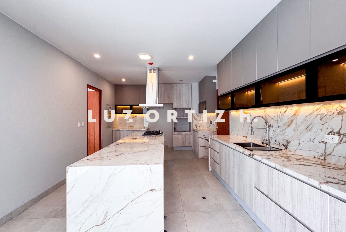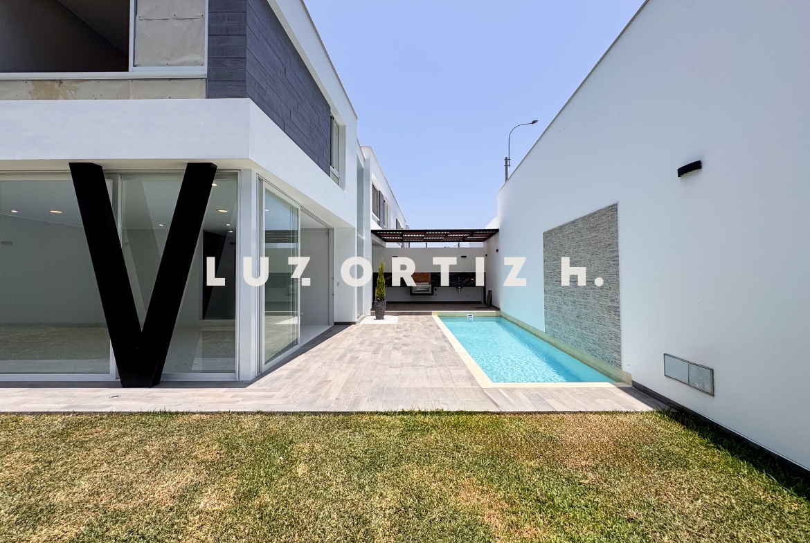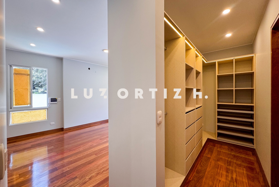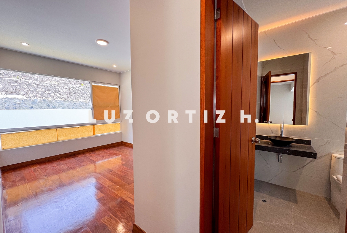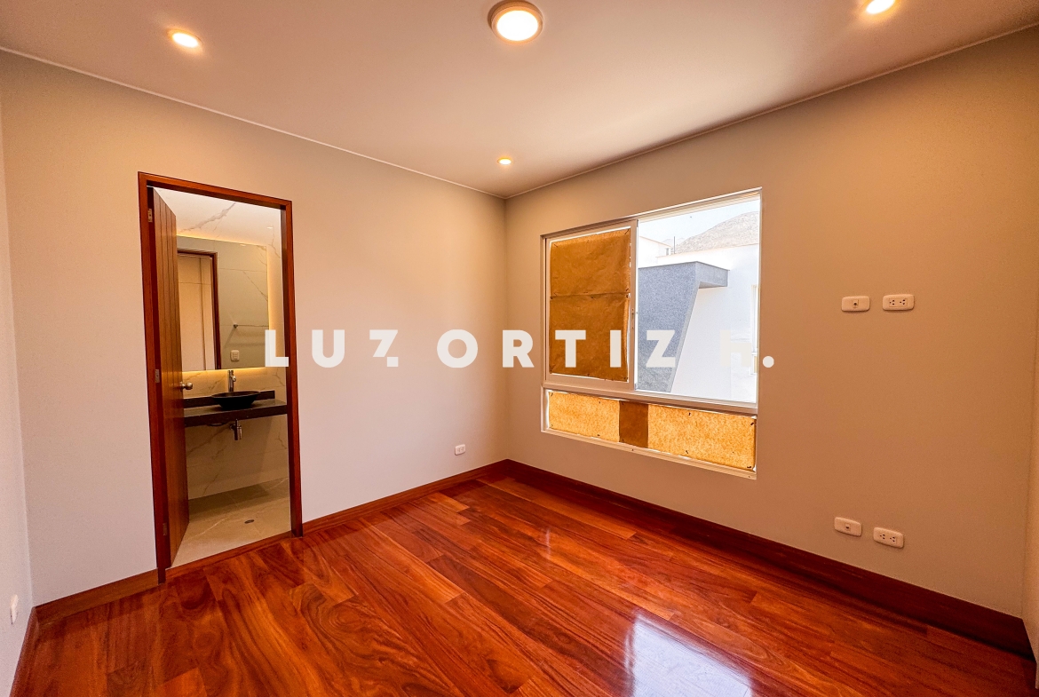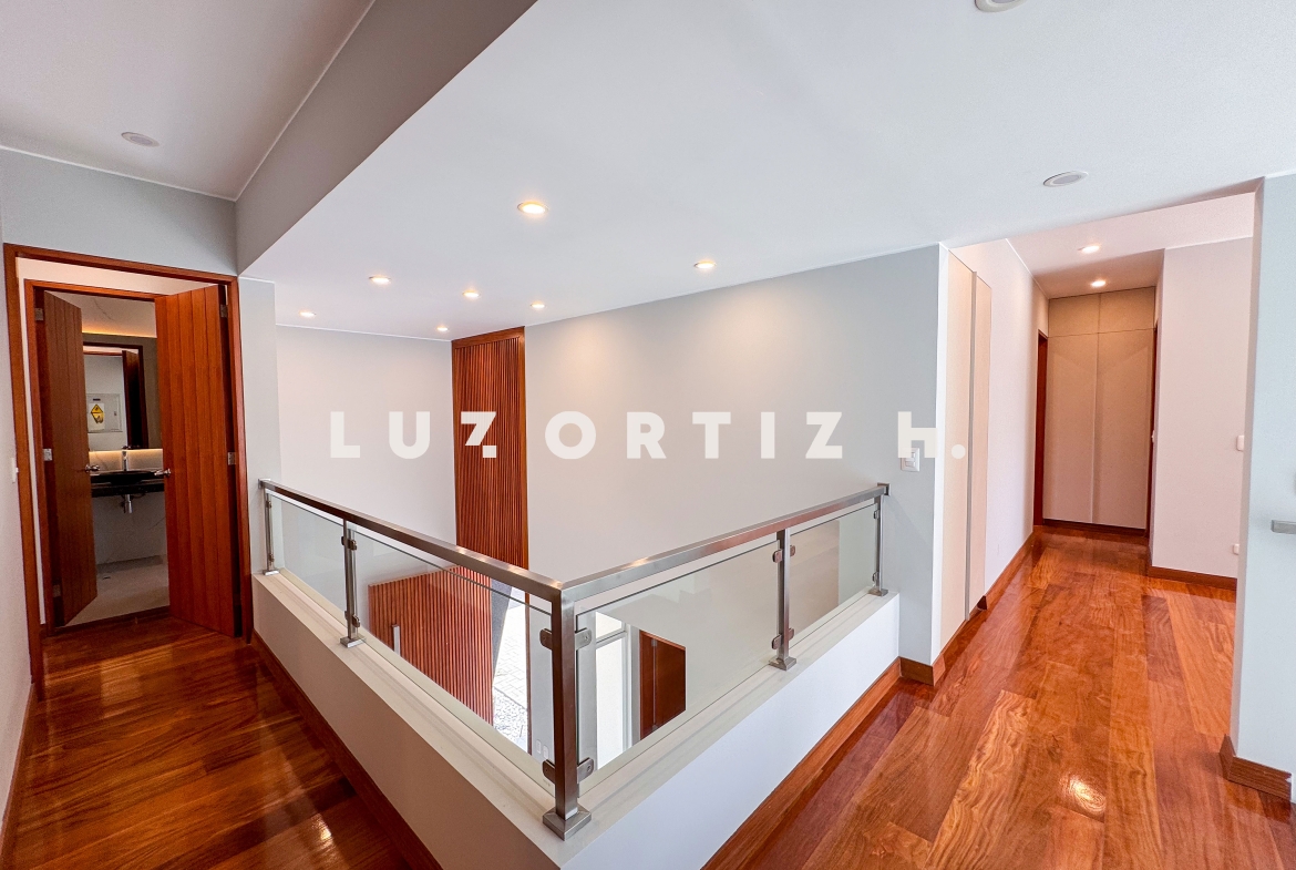En el primer nivel, un elegante hall de ingreso da la bienvenida a una amplia sala y comedor con excelente iluminación natural y vista directa a la terraza. La terraza cuenta con una zona de parrilla ideal para reuniones sociales y familiares, además de una piscina privada perfecta para disfrutar del sol durante todo el año. La cocina es cerrada, moderna y funcional, equipada con muebles altos y bajos en melamina de alta calidad y tablero de granito. También dispone de un baño de visitas y un estudio u oficina, ideal para el trabajo remoto o como sala de lectura.