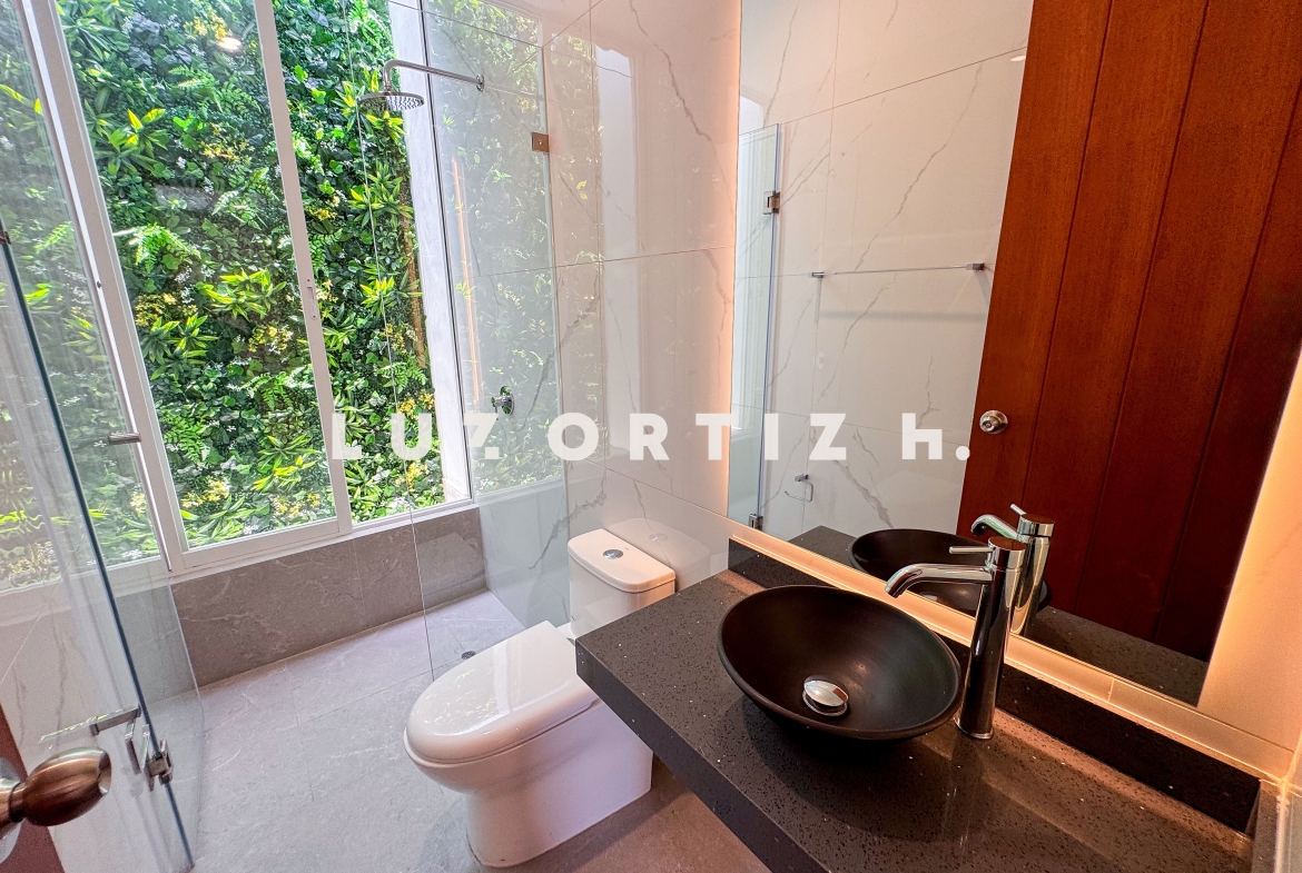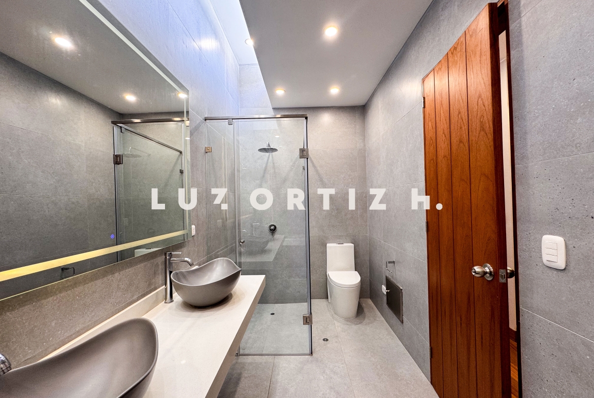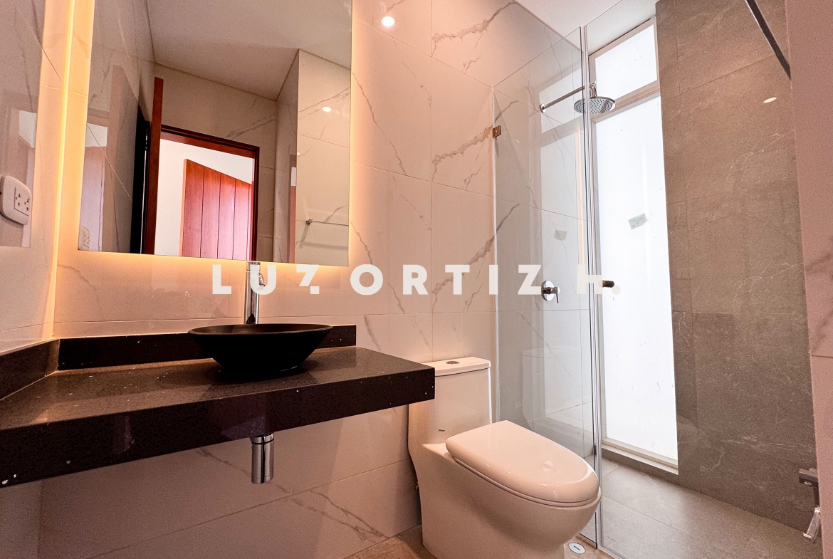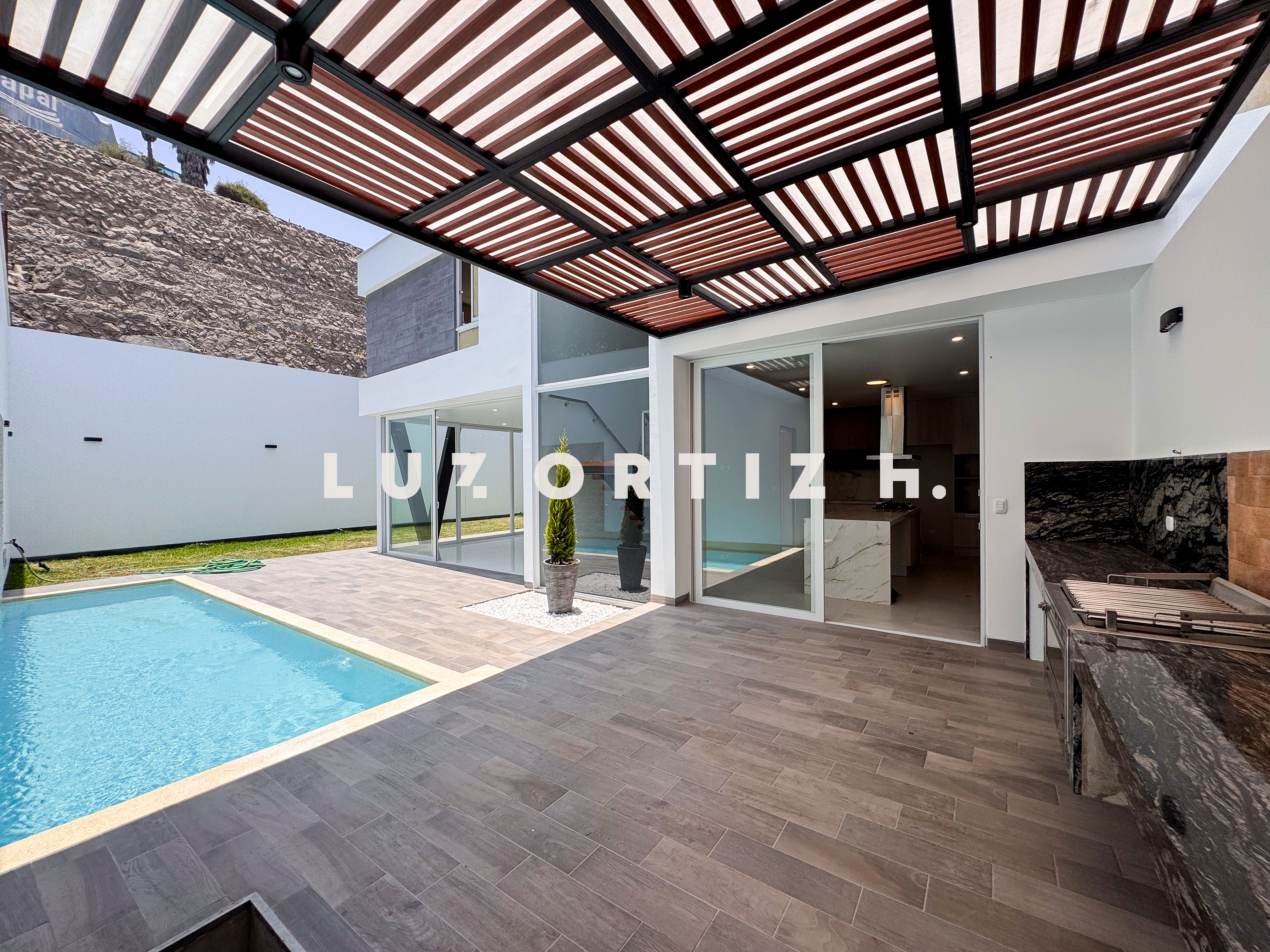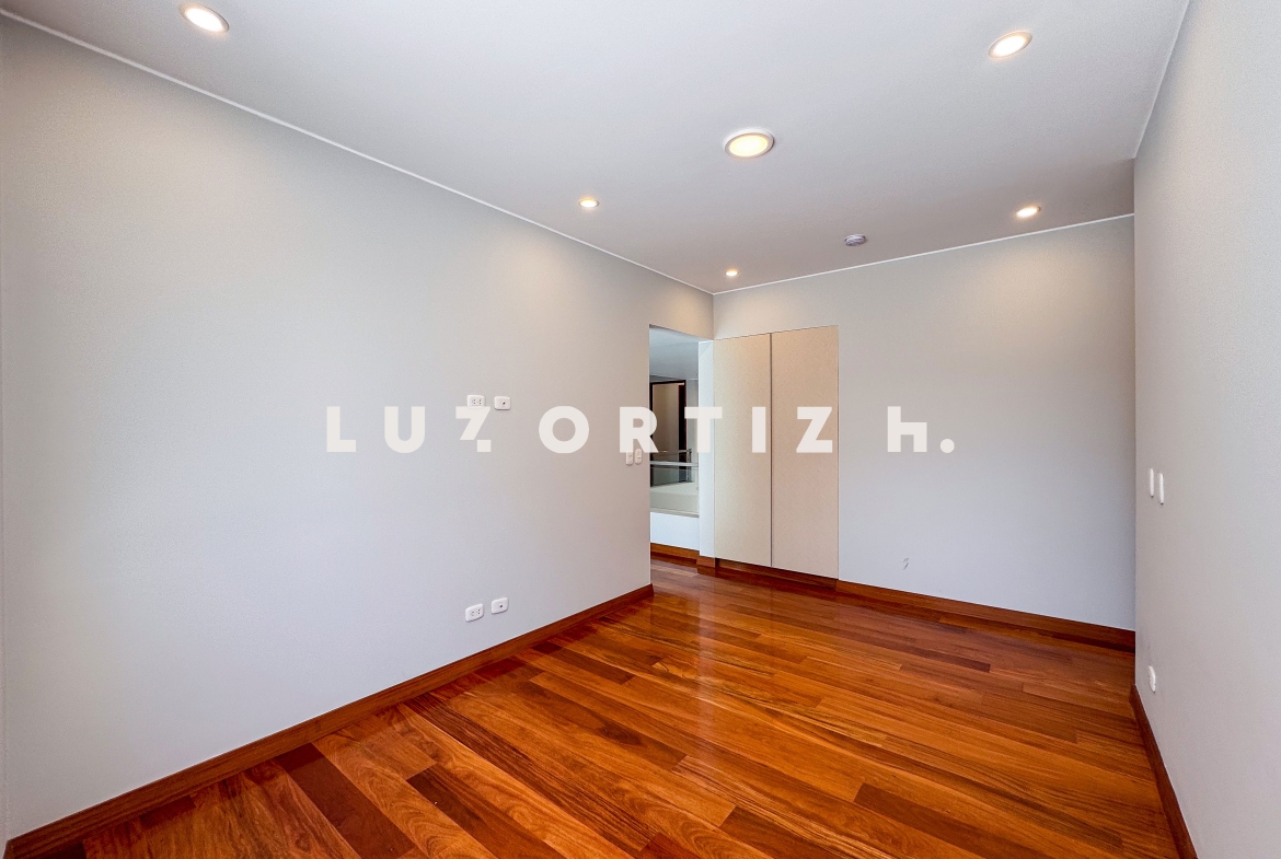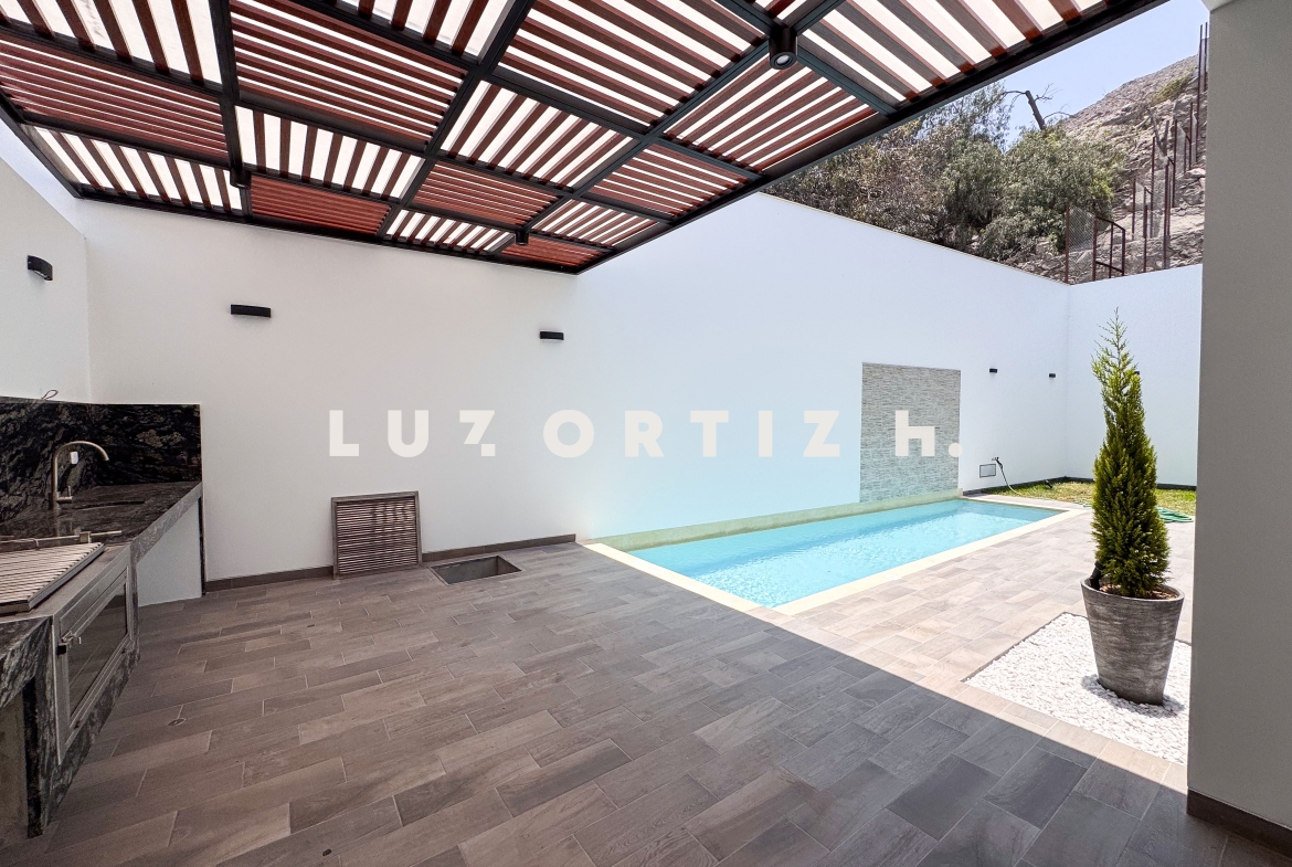 En el primer nivel, un elegante hall de ingreso da la bienvenida a una amplia sala y comedor con excelente iluminación natural y vista directa a la terraza. La terraza cuenta con una zona de parrilla ideal para reuniones sociales y familiares, además de una piscina privada perfecta para disfrutar del sol durante todo el año. La cocina es cerrada, moderna y funcional, equipada con muebles altos y bajos en melamina de alta calidad y tablero de granito. También dispone de un baño de visitas y un estudio u oficina, ideal para el trabajo remoto o como sala de lectura.
